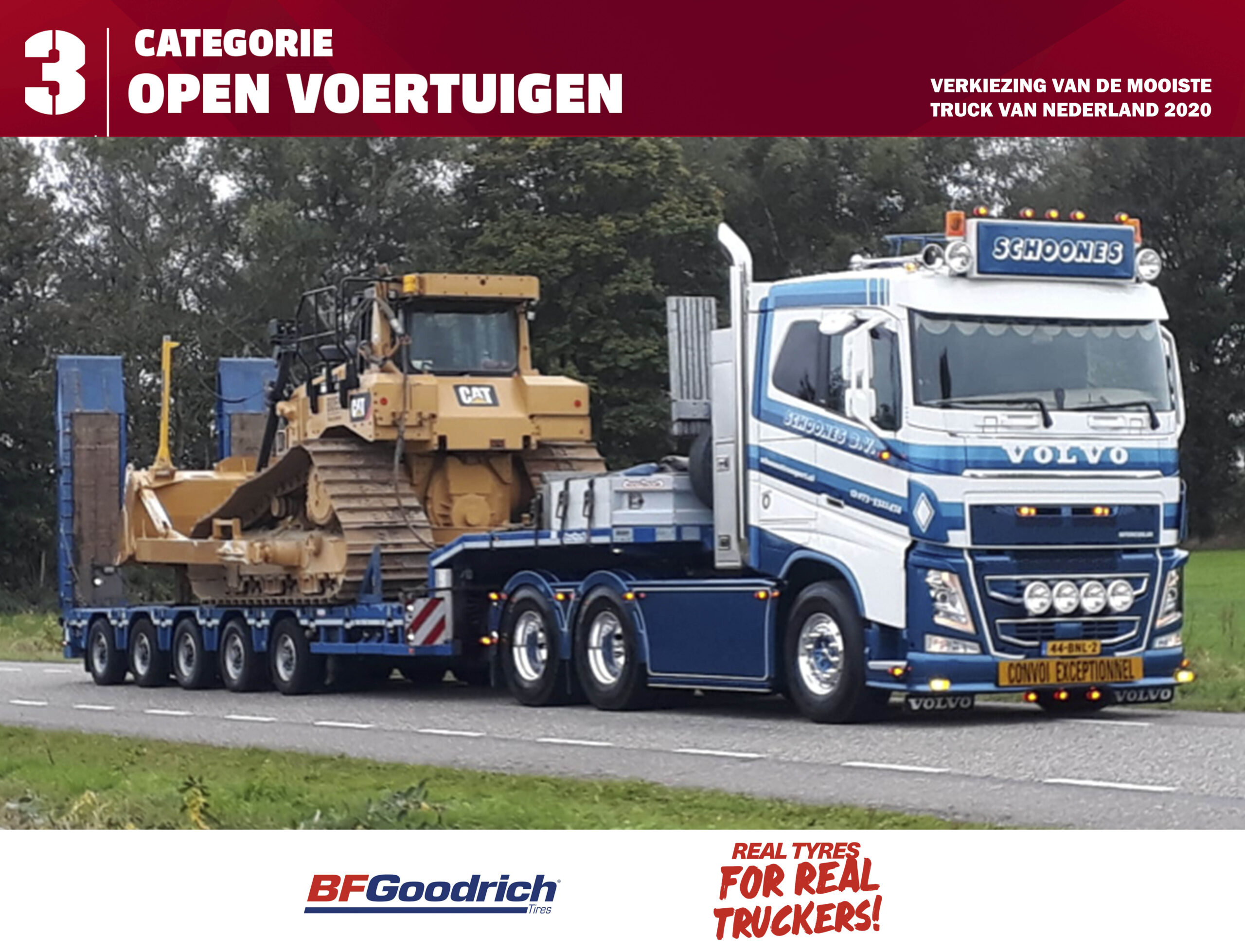 Het wordt nog even flink poetsen voor Bram Schoones (21) uit Vinkel voordat hij met zijn Volvo FH 540 naar de verkiezingsdag komt. Hij wil namelijk dat zijn auto, die bijna een jaar oud is, er dan weer helemaal als nieuw uitziet. Bram doet allerlei soorten transport met zijn trekker. Het mooiste vindt hij het werk in het uitzonderlijk vervoer. Het meest trots is Bram op de tekst ‘Broederliefde’ die achterop de auto in de kastenwand is uitgesneden. “Het is een herinnering aan mijn broertje, die een paar jaar geleden is overleden aan de gevolgen van een ongeluk. Op deze manier is hij toch altijd bij me.”
