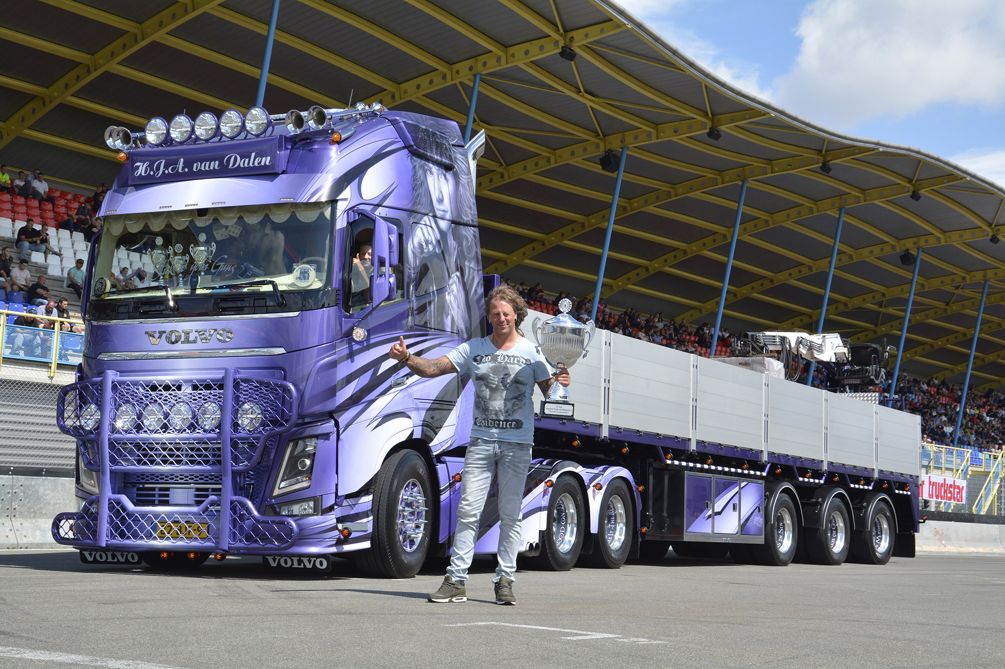 Als je chauffeur bij Van Berne Transport bent, is het vrijwel zeker dat je met een uiterst fraaie wagen op pad wordt gestuurd, want dat bedrijf staat al jaren bekend om zijn prachtig opgebouwde trucks. Toch vond Maarten Bijvelds (54) uit Hedel het heel spannend of zijn Volvo FH 500 weer zou worden genomineerd. “Er zijn tegenwoordig zoveel mooie trucks op de weg dat het lijkt alsof er steeds meer geld aan wordt besteed”, aldus Maarten. Toch denkt hij dat zijn truck een goede kans maakt bij de verkiezing, omdat hij niet alleen fraai gespoten en heel doordacht is opgebouwd, maar omdat er ook dagelijks hard mee wordt gewerkt.