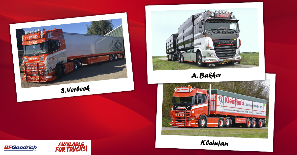 De verkiezing van de Mooiste Truck van Nederland wordt mede mogelijk gemaakt door BFGoodrich. Deze van oorsprong Amerikaanse bandenfabrikant is in 150 jaar uitgegroeid tot een wereldwijde organisatie die actief is in 140 landen. BFGoodrich maakt en levert banden voor alle marktsegmenten en bracht eerder dit jaar zijn nieuw bandengamma voor of/off gebruiksomstandigheden op de markt: de BFGoodrich Cross Control 2. Kijk voor meer informatie op truck.bfgoodrich.nl