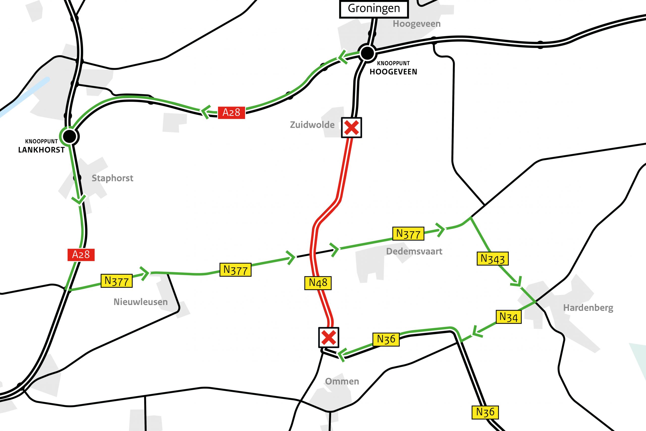 - Verkeer vanuit het noorden richting het zuiden wordt omgeleid via de A28 en de N377 en verkeer vanuit het zuiden andersom.