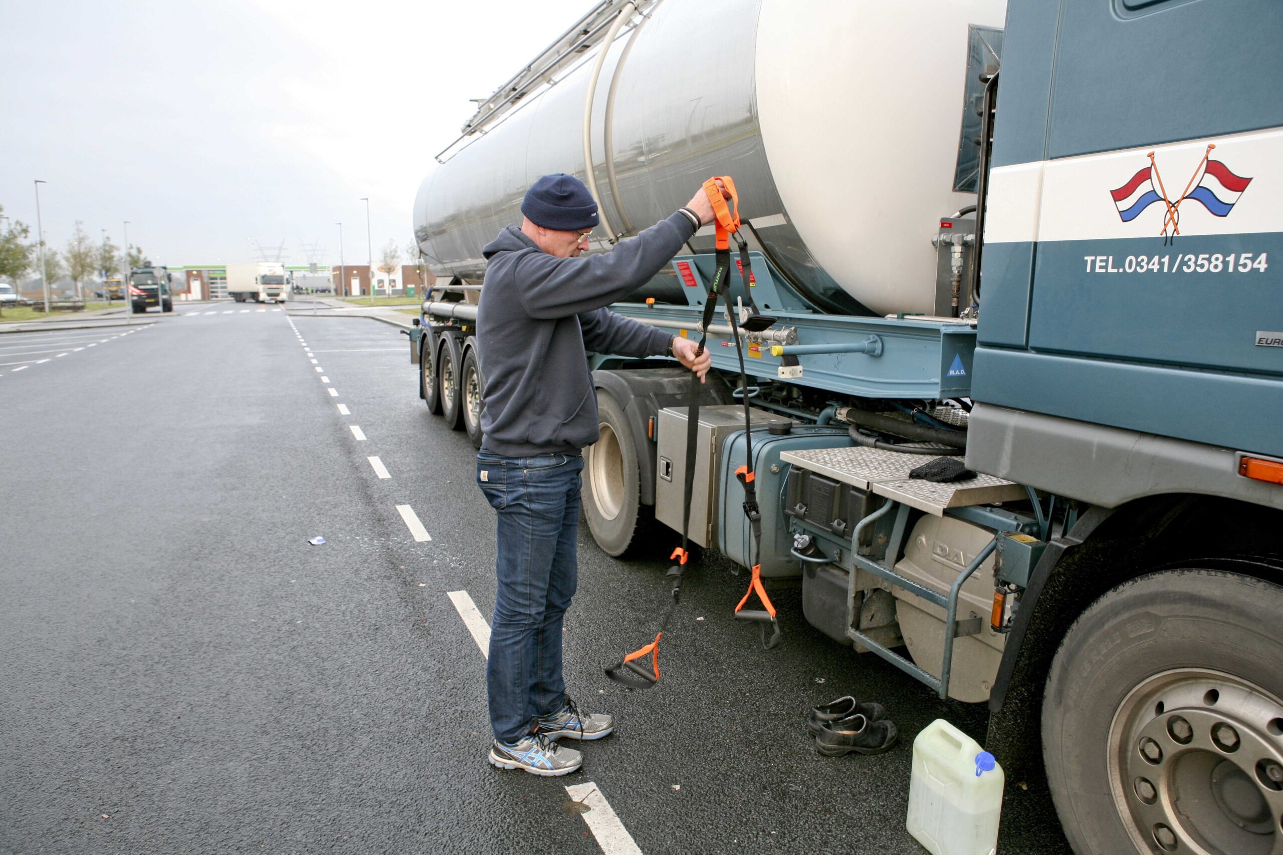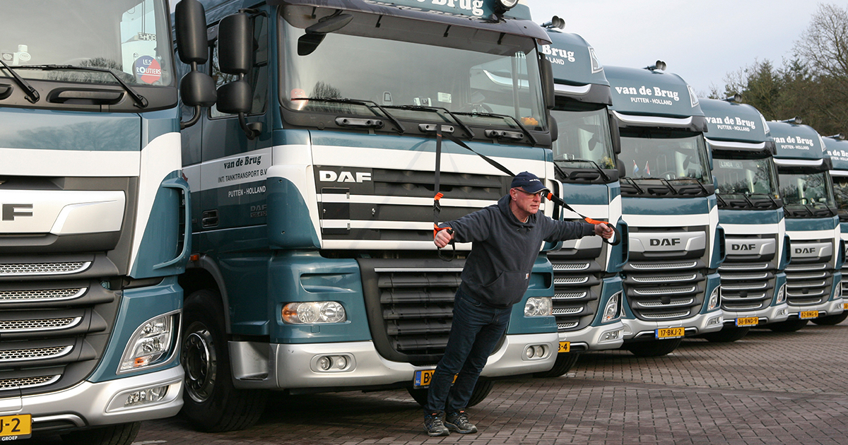 Op de A1, bij BP Honswijck, zet Han zijn truck aan de kant. Hoog tijd om even wat oefeningen te doen. Daarvoor hebt je niet veel nodig. Je kunt zelfs je combinatie als fitnessapparaat gebruiken, zegt hij. Han draait zich om en haalt twee touwen met handvatten vanonder zijn matras. Normaal gesproken hangen die aan een muur, maar Han bevestigt ze aan de trap van de tanktrailer. Hiermee kan hij TRX-oefeningen doen – dat staat voor Total Resistance eXercise – zoals row wide, chest press, fly en jump squat. “TRX is ontwikkeld door een Amerikaanse Navy Seal. Zo kunnen mariniers onderweg met heel weinig materiaal toch supereffectief trainen.”