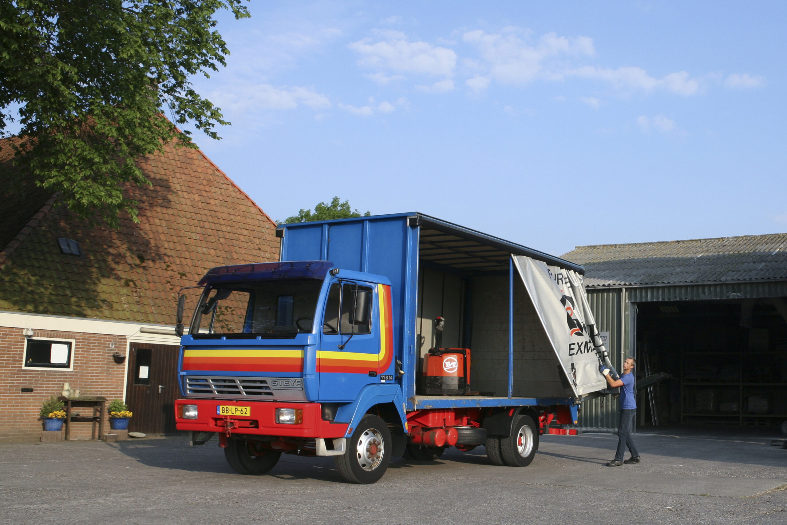 Nadat de schuifzeilen zijn geopend, laat hij de laadklep naar beneden komen. Die is niet origineel meer. In 2013 is er een nieuwe van Anteo opgekomen. Eentje die meer gewicht kon hebben. Hij wijst op een van de big bags. “Die weegt gevuld toch gauw een ton.”