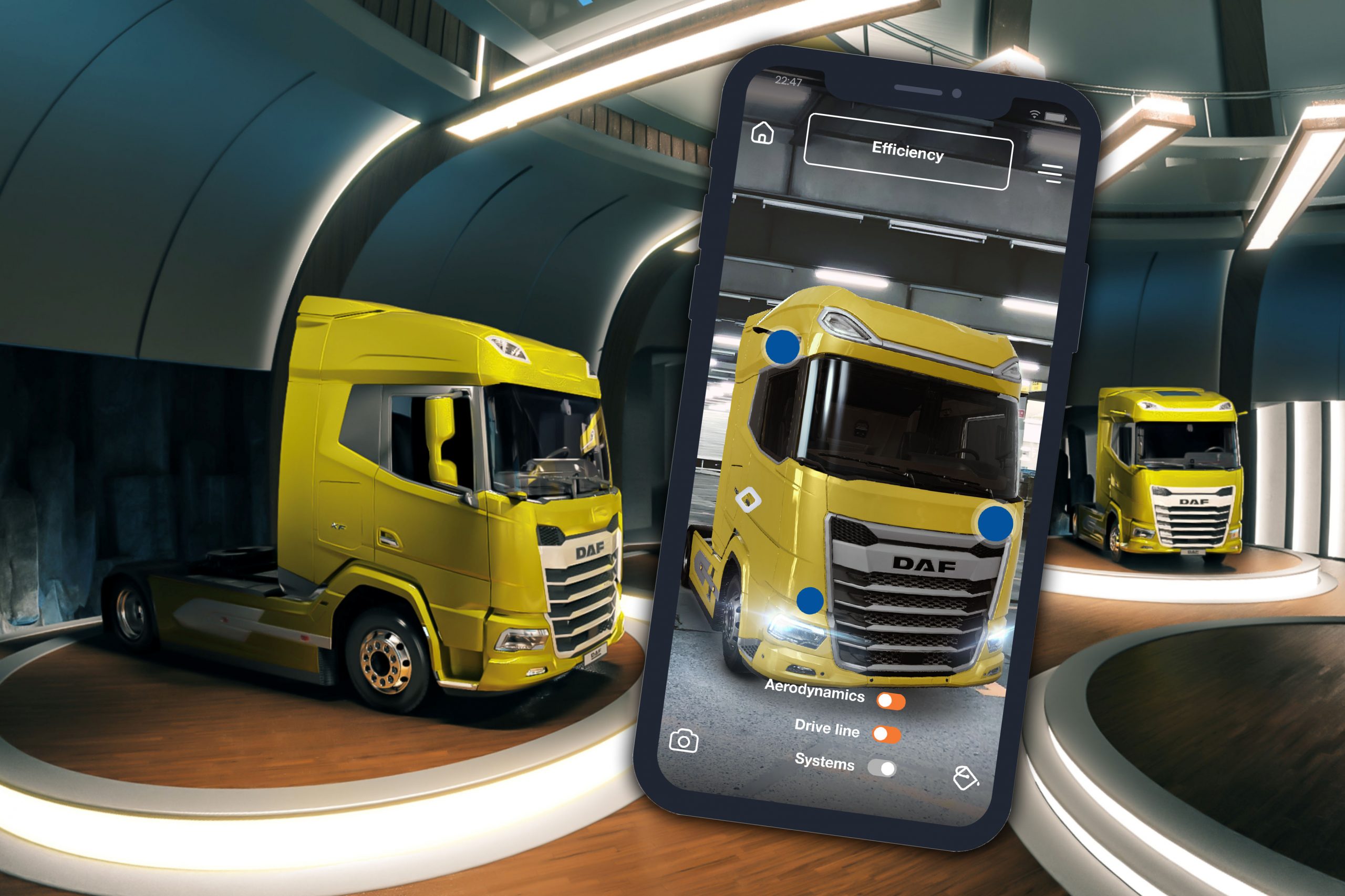 Met een enkele swipe kan in de interactieve augmented reality-app New Generation DAF (gratis via de app stores van Google Play en Apple) de XF, XG en XG+ op het scherm van elk mobiel apparaat worden getoverd. De software en de camera van de mobiele telefoon of tablet zetten de truck vervolgens op iedere gewenste plaats neer. Bovenop een bureau, bijvoorbeeld. Op een parkeerplaats of zelfs in een woonkamer. Daarna kunnen app-gebruikers vanuit de luie stoel het voertuig tot op detailniveau – en vanuit elke hoek – ontdekken, zowel van binnen als van buiten.