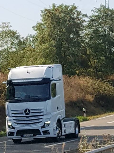 Marcel kwam de nieuwe Actros tegen op de B9 bij Wörth, de thuisbasis van Mercedes-Benz trucks. Mercedes-Benz heeft ook al wat foto’s van de nieuwe Actros vrijgegeven, maar het gaat daarbij vooral om silhouet-foto’s die weinig laten zien van de daadwerkelijke truck. Uit de foto die Marcel maakte, blijkt aan het uiterlijk weinig veranderd te zijn. Geheel nieuw is wel het ontbreken van buitenspiegels. Wij vragen ons af of dit in alle landen van de Europese Unie is toegestaan: in diverse landen zijn de minimale afmetingen van buitenspiegels wettelijk vastgelegd.
