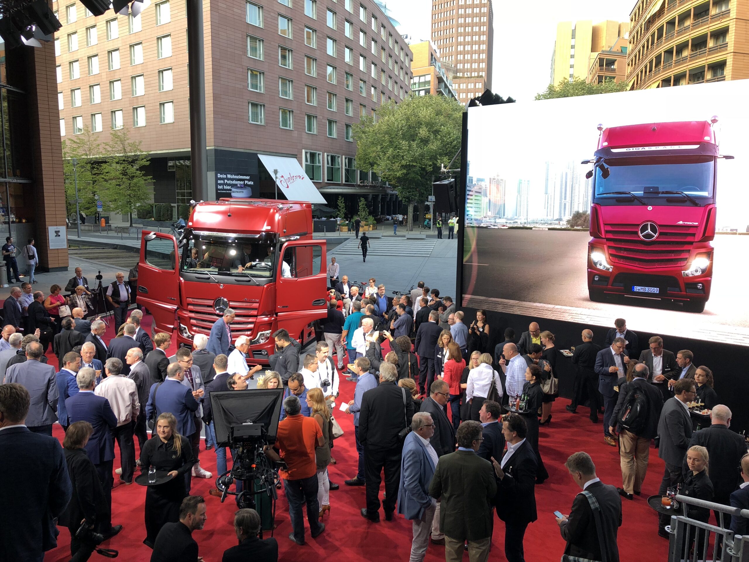 De nieuwe Actros kan zelfstandig sturen en heeft geen achteruitkijkspiegels meer. Mercedes introduceerde de nieuwe Actros vanavond op de Potsdamer Platz, midden in Berlijn.