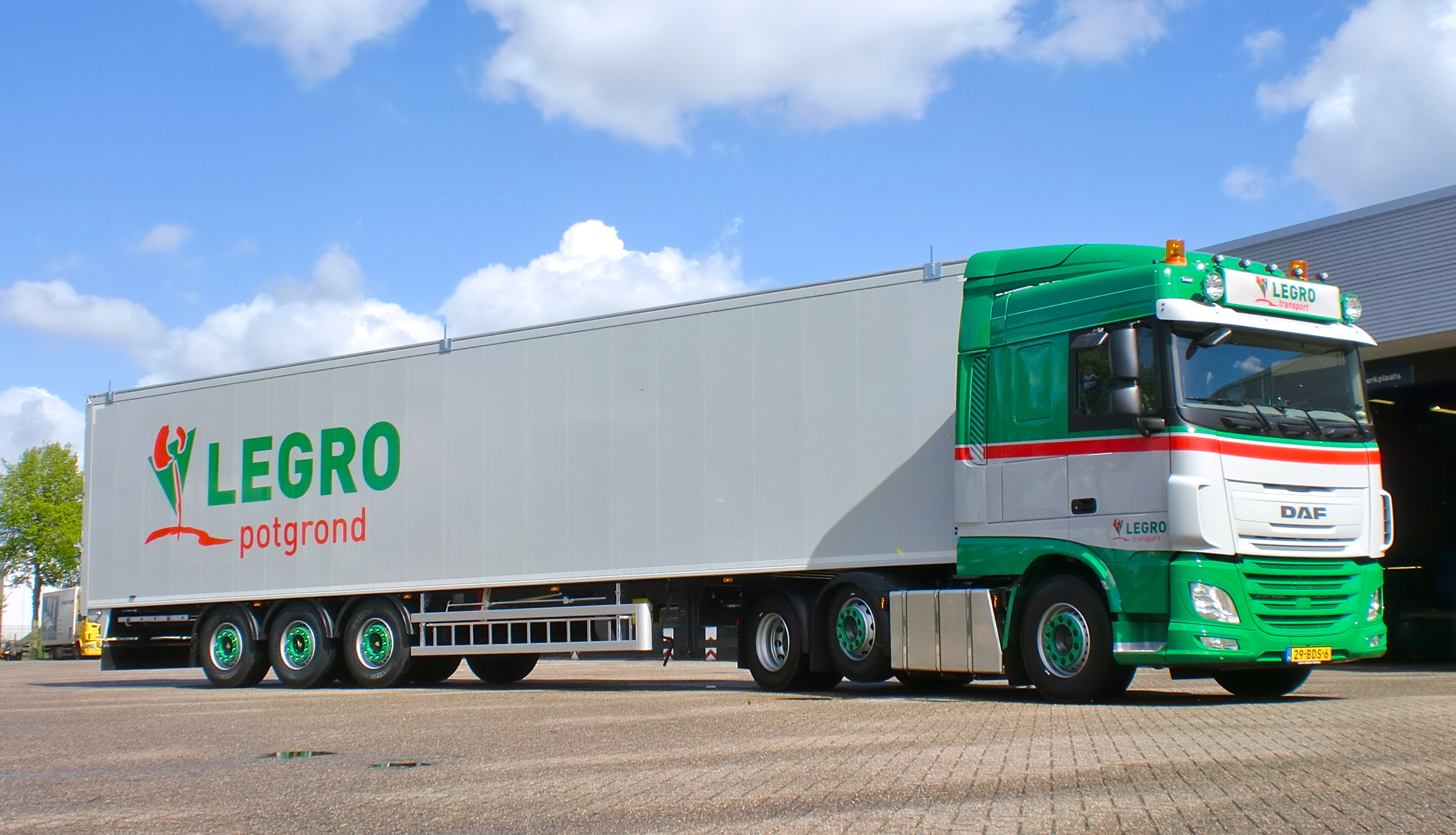 De Spacecab cabine is uitgerust met diverse zaken die het werk van de chauffeur veraangenamen: een royale koelkast, luchtgeveerde chauffeursstoel, airco, en de DAF Driver Performance Assistant (DPA) die de chauffeur ondersteunt tijdens het rijden. De schuifvloertrailer is geleverd door Knapen Trailers in Deurne. De nieuwe DAF zal door Legro vooral ingezet worden op Engeland.