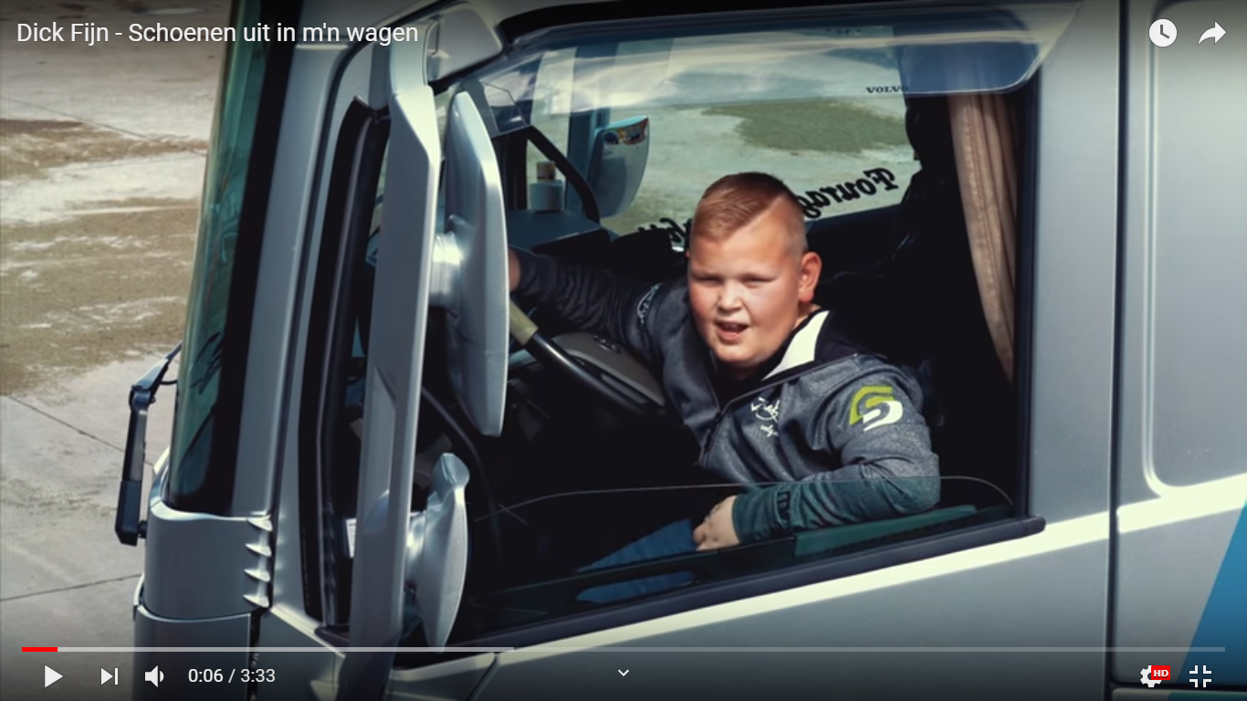 Het vorige nummer van Dick, met de titel ‘Gewoon een trucker’, is meer dan 800.000 keer bekeken. Het nieuwe nummer heeft de titel ‘Schoenen uit in m’n wagen’. Dick bezingt hier zijn liefde voor de truck: iedereen die de cabine inkomt, moet de schoenen uitdoen. De videoclip is opgenomen in een truck van Jan Bakker; in de vorige video zat Dick in de Scania V8 van zijn oom.