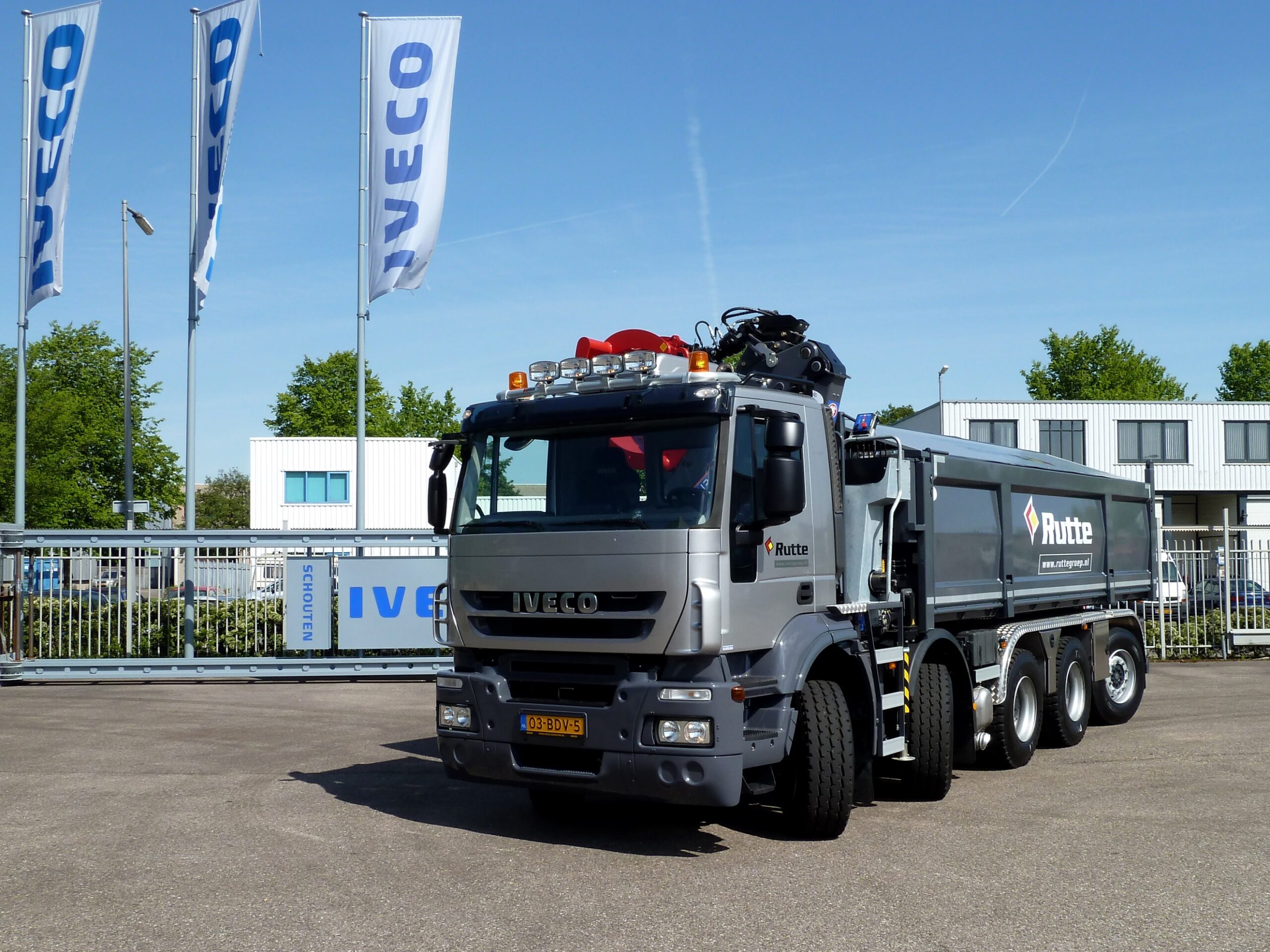 De Rutte Groep bezit een zeer divers wagenpark en verschillend specialistisch materieel. De Amsterdamse Rutte Groep heeft op dit moment een wagenpark van negen eigen zware voertuigen van type IVECO Trakker en drie lichtere voertuigen van het type IVECO Daily. Rutte Groep kan met de zeer complete en divers uitgeruste voertuigen voor alle werkzaamheden het juiste materieel inzetten. De heer Rutte: “De transportbehoefte van Rutte Groep is veelzijdig, en voornamelijk voor de werkzaamheden van het wegenbouwbedrijf .” Onlangs heeft Rutte hiervoor een nieuwe IVECO Trakker 10×4 in gebruik genomen.