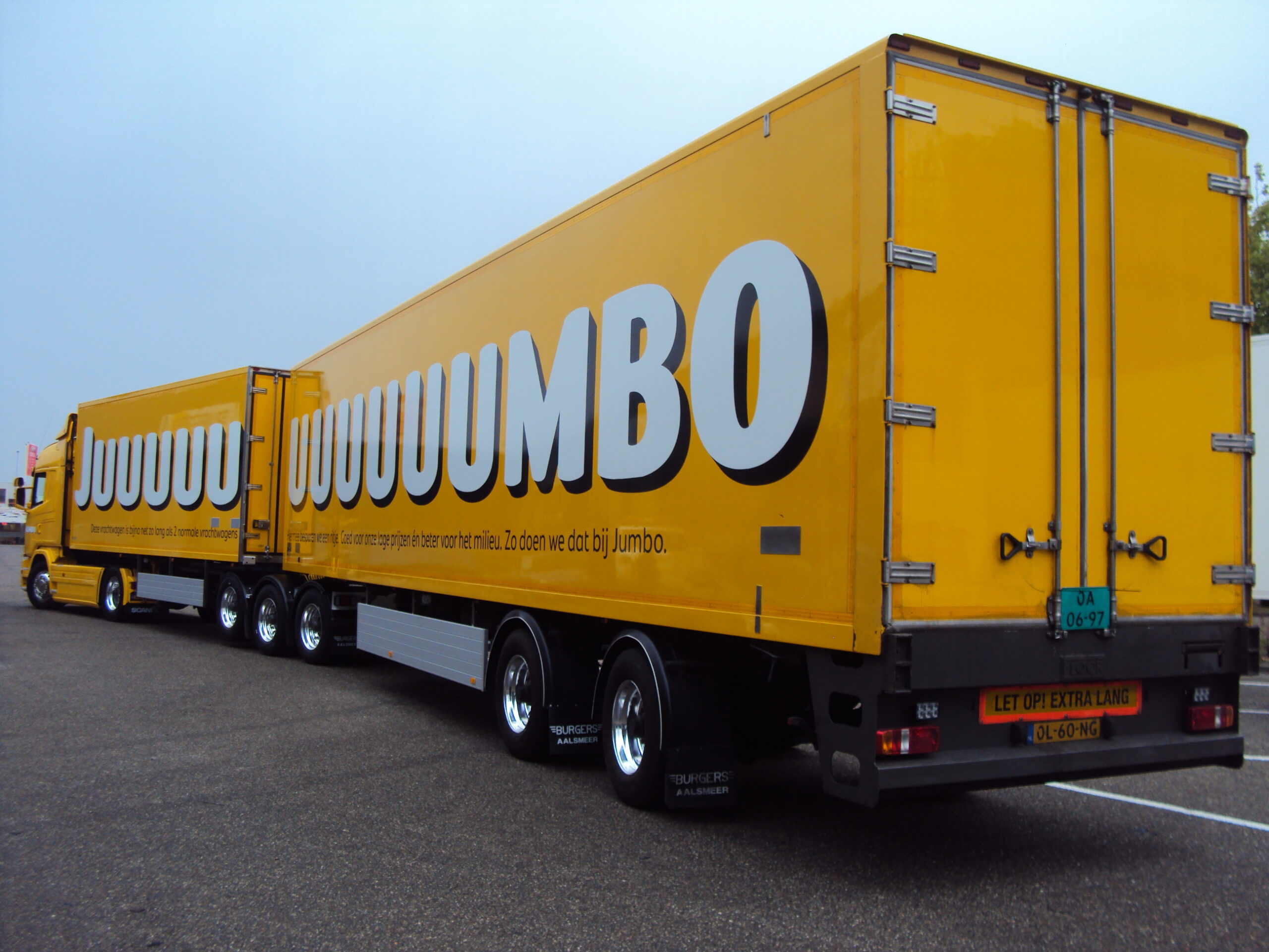 De combinatie van drieassige slider trailer, gekoppeld aan een gewone oplegger is vervaardigd door Burgers Carrosserie uit Veghel. Dankzij een doorlaadsysteem hoeven de chauffeurs van Jumbo bij het dok geen trailers los te koppelen als ze willen laden of lossen.