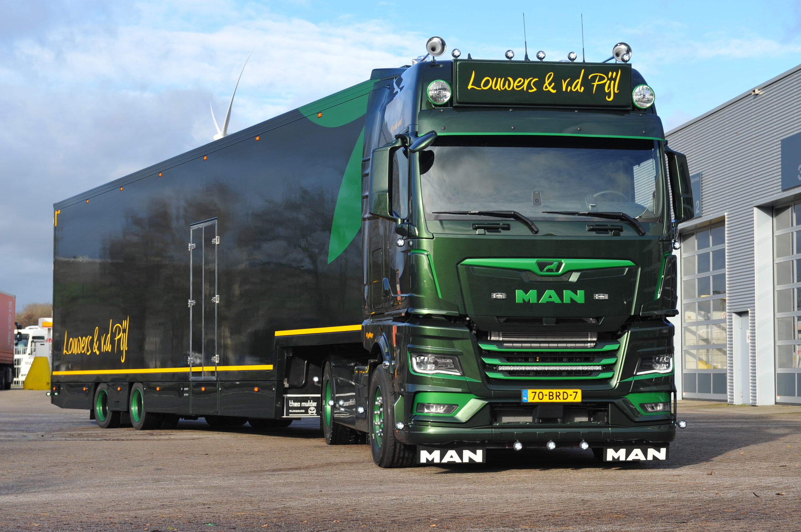 De nieuwe MAN is de eerste uit een serie van drie. Deze TGX is volledig luchtgeveerd en heeft een motor die 510 pk levert. Dat standkachel en airco onopvallend geïntegreerd zijn, ervaart het bedrijf als een pre. Duidelijk is ook dat Louwers & Van der Pijl het nuttige met het aangename wil verenigen. Dat betekent leren stoelen en een met leer bekleed stuurwiel. Houten afwerklijsten en natuurlijk is de nieuwe MAN rondom voorzien van LED-verlichting met de voor trucks unieke automatische grootlichtassistent. De allerlaatste stand van techniek qua veiligheid is aan boord, inclusief de nieuwste rijbaanwissel- en dodehoek-assistent.