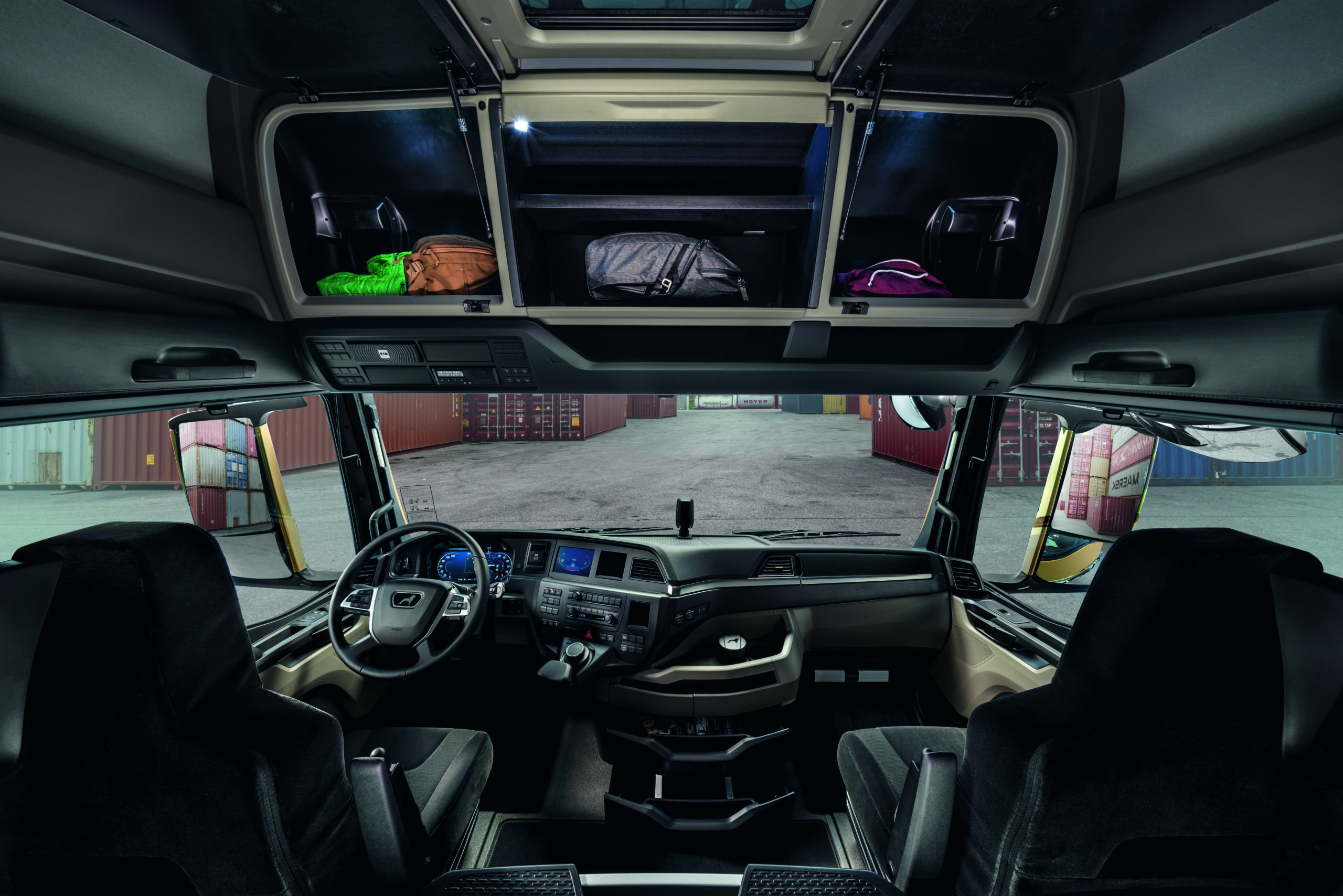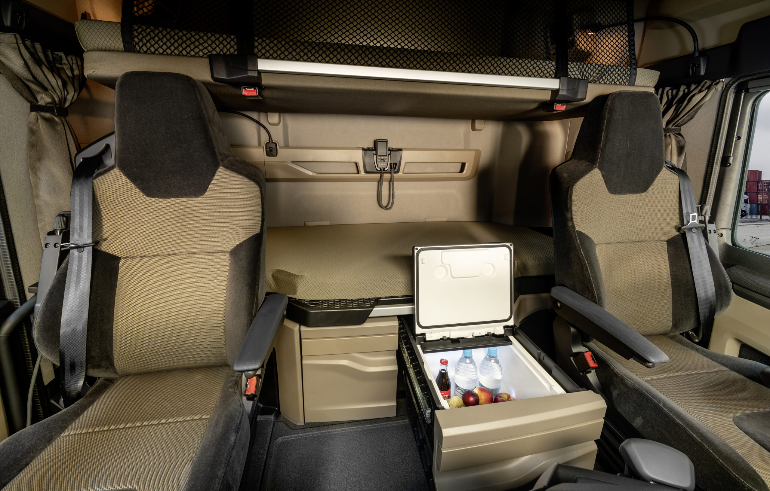 De basis van de cabines van MAN’s nieuwe truckgeneratie is hetzelfde als het huidige model. Vanbinnen is de cabine compleet vernieuwd, en dat was wat ons betreft ook wel nodig. Wat meteen opvalt is de SmartSelect-bediening, een druk- en draaiknop zoals we deze ook kennen in personenauto’s van concerngenoot Audi. Met deze knop kan je het display en al zijn functies bedienen.