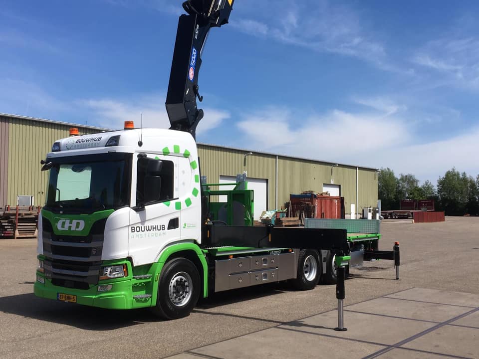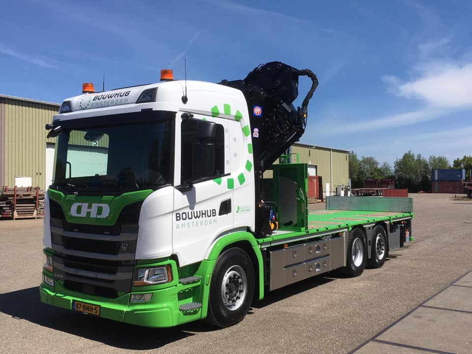 Bijzonder aan de nieuwe bakwagen is dat hij niet is uitgevoerd in de bekende rood/witte bedrijfskleuren maar in het wit/groen van opdrachtgever Bouwhub Amsterdam. Verder rijdt de 6×2 Scania op biodiesel wat niet alleen onderweg maar ook bij het hijsen helpt om de uitstoot te verminderen. Aan de zijkant van het chassis zijn in RVS diverse handige kisten aangebracht. Het wagenpark van C.H. Dekker bestaat inmiddels uit ruim 40 trucks en 100 opleggers. De auto werd geleverd door Scania Regio Noord West.