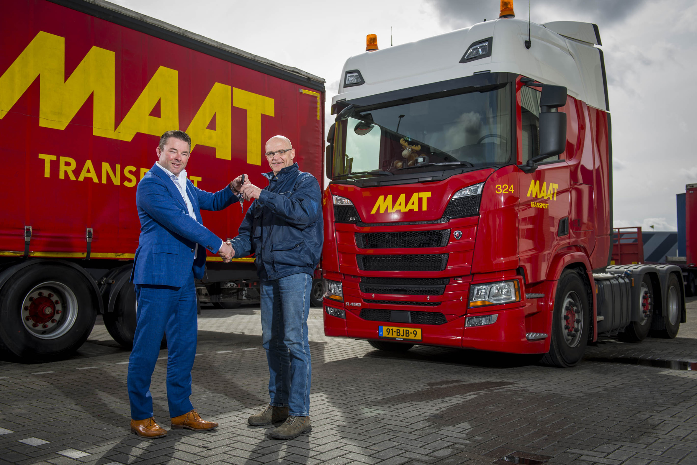 Maat is een allround logistiek dienstverlener met zeven vestigingen. Het allround karakter komt terug in de configuratie van de 90 voertuigen. “Wij rijden zowel met semi-diepladers als zeilentrailers en gesloten opleggers. Daarom kozen wij ook met deze R450 voor een drie-asser. Dan kun je in Nederland onder alle omstandigheden je 50 ton pakken zonder op een gegeven moment op één as te zwaar te zijn,” aldus Arjan Maat. Dat het een Scania moest worden, stond eigenlijk van tevoren al vast. “Wij hebben officieel een drie merken strategie, maar daarin is Scania zeer ruim vertegenwoordigd. Deze NGS R450 is voor ons de volbloed onder de trucks en een aanwinst voor het bedrijf.
