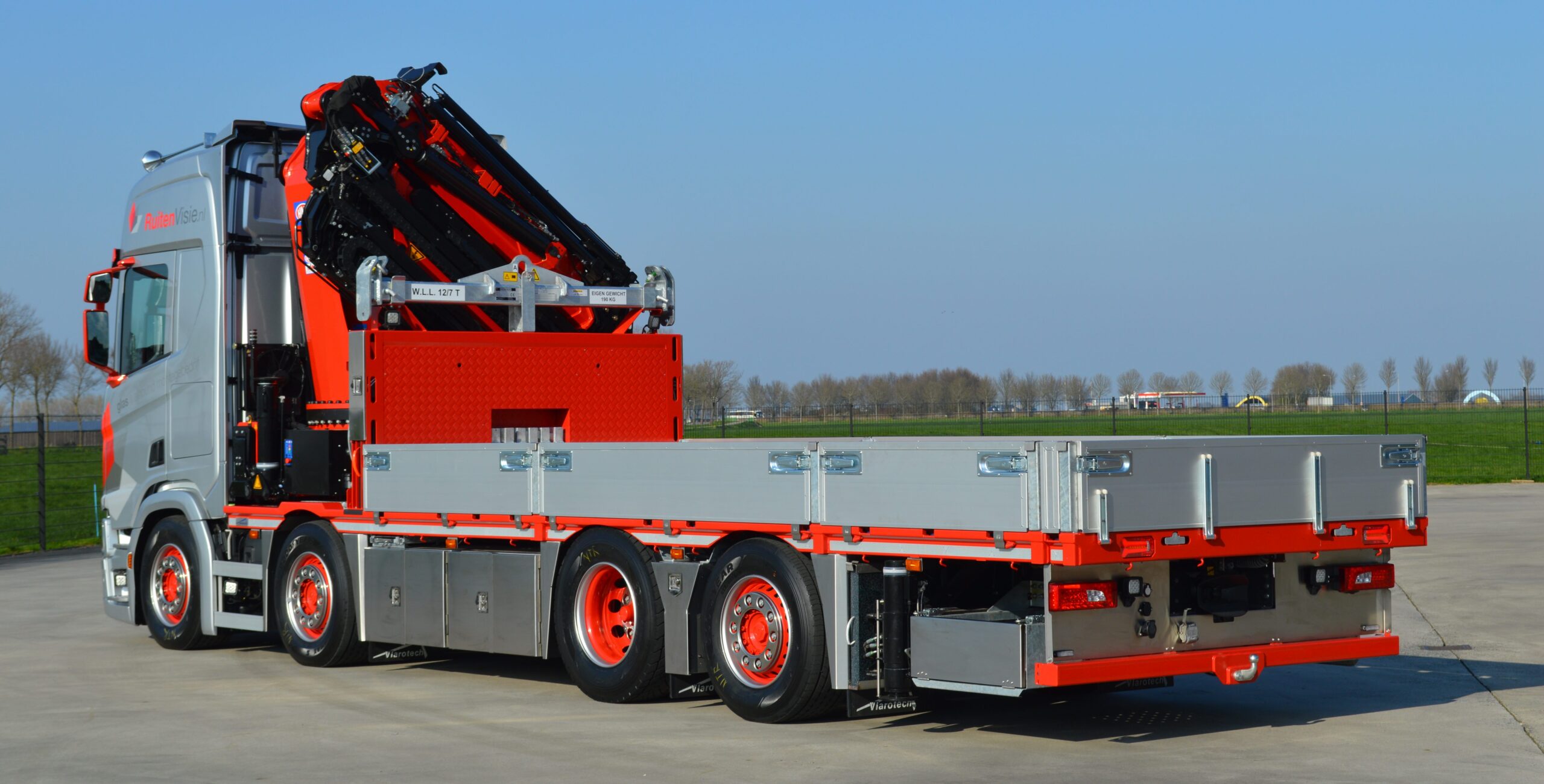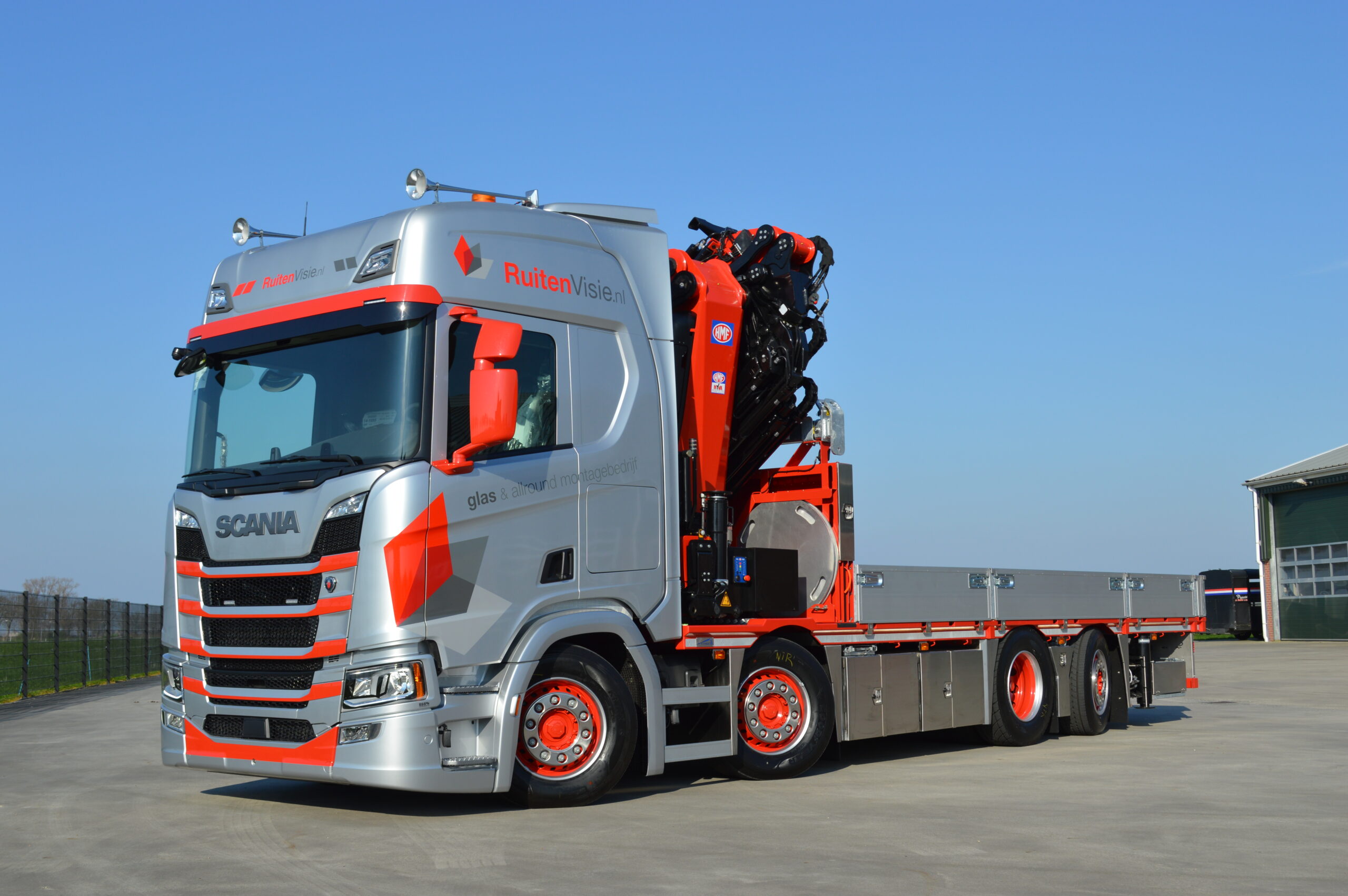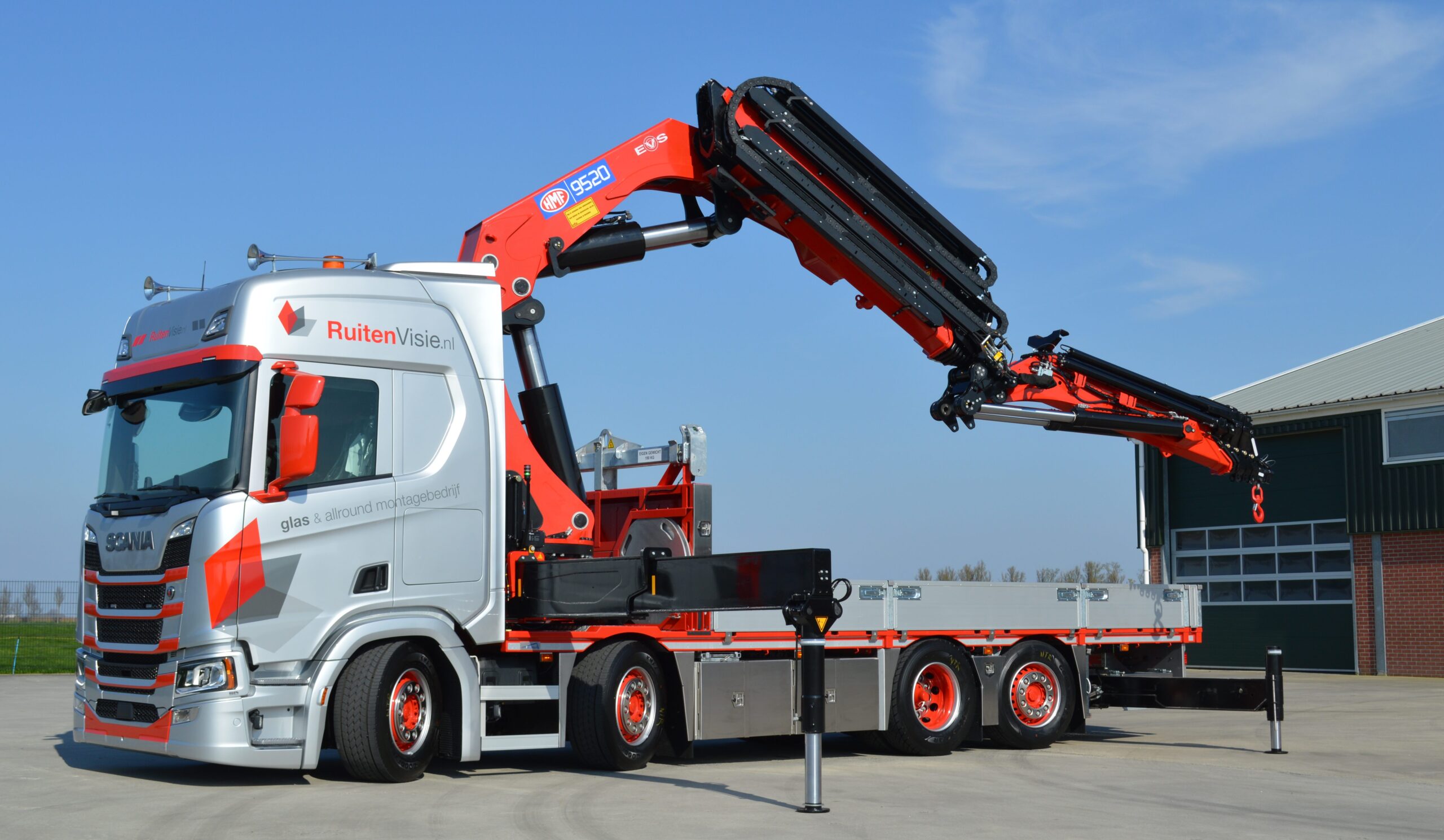 De combinatie is door Vlarotech (vestiging Benningbroek) gebouwd in samenwerking met Scania Regio Noord West (vestiging Zwaagdijk). Achter de cabine is nu gekozen voor de HMF9520 + Jib die is voorzien van dubbele loadsense pompen om vlot en nauwkeurig te kunnen draaien. Voor het bedienen op afstand is er een afstandsbediening met kleurendisplay. Patrick Vlaar van RuitenVisie: “We moesten met de tijd mee want ruiten en kozijnen worden steeds groter en zwaarder. Dus moest de nieuwe kraan ook zwaarder worden. Bovendien kunnen we met deze tot 38 meter hoogte komen, met jib kunnen we nog hoger.”