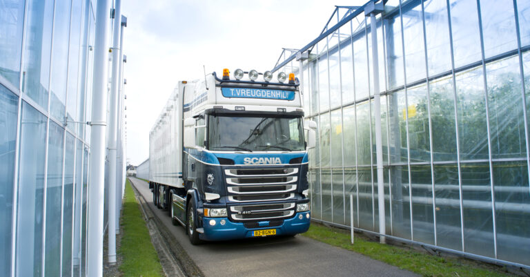De trucks van T. Vreugdenhil zijn vaak tussen de kassen te vinden.