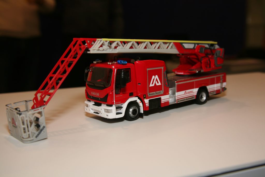Een ander merk dat veel trucks in 1:43 heeft, is het Franse Eligor. Nieuws is er hier in de vorm van de DAF XF of Volvo FH als bakwagen met wipkar. Verder is het merk sterk in brandweerwagens. Nieuw in het programma is een ladderwagen met Iveco Eurocargo cabine. In de loop van 2019 zijn er nog meer nieuwe brandweervoertuigen te verwachten waarvan nu de handmonsters in de vitrine stonden. Reken op juni voor de Renault Xerax met opbouw voor blusmiddelen. De Scania met crewcab en ook de Renault Xerax met manschappencabine volgen ergens augustus/september. Aan het eind van het jaar volgt dan de zware Renault C380 drieasser.