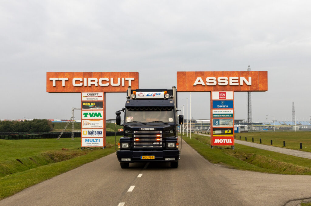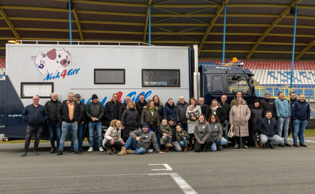 Ons team hield respectvol afstand terwijl de familieleden en vrienden dit bijzondere moment deelden, even samen zonder alle ellende. Al snel werd het konvooi in gang gezet, begroet door tegemoetkomende collega’s, wat de rit extra speciaal maakte. De route leidde naar het TT Circuit van Assen, waar we toegang kregen tot het circuit, de tunnelbak doorreden en parkeerden op het paddock. Daarna mocht de Noah4All wensvrachtwagen op de startlijn staan voor een groepsfoto, een bijzonder moment.