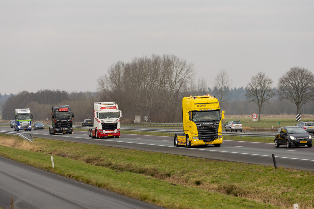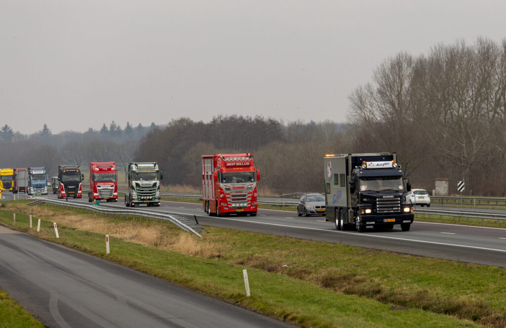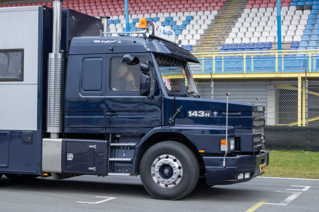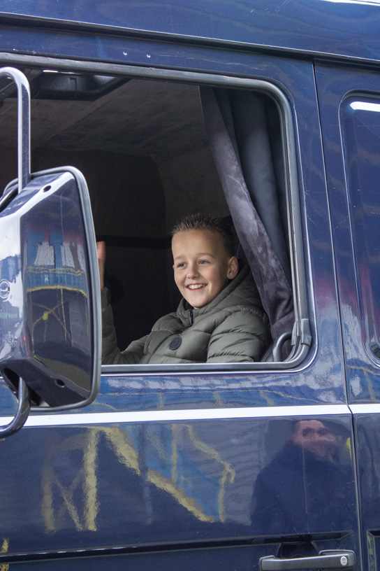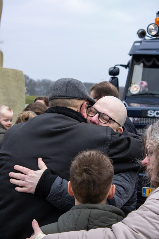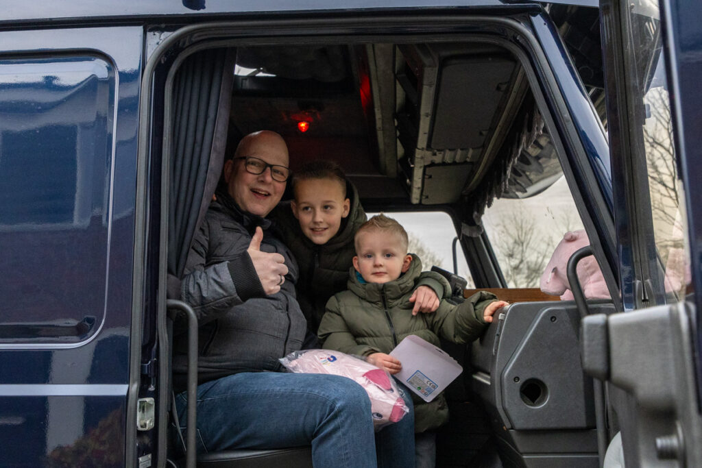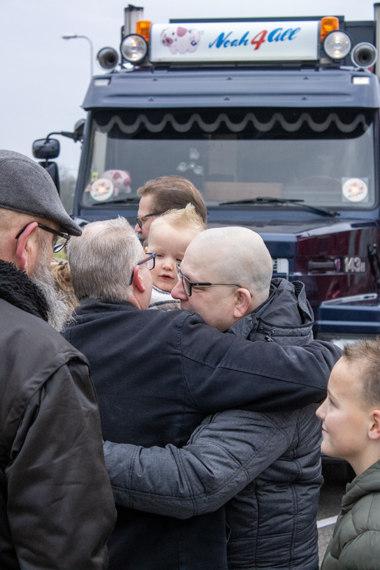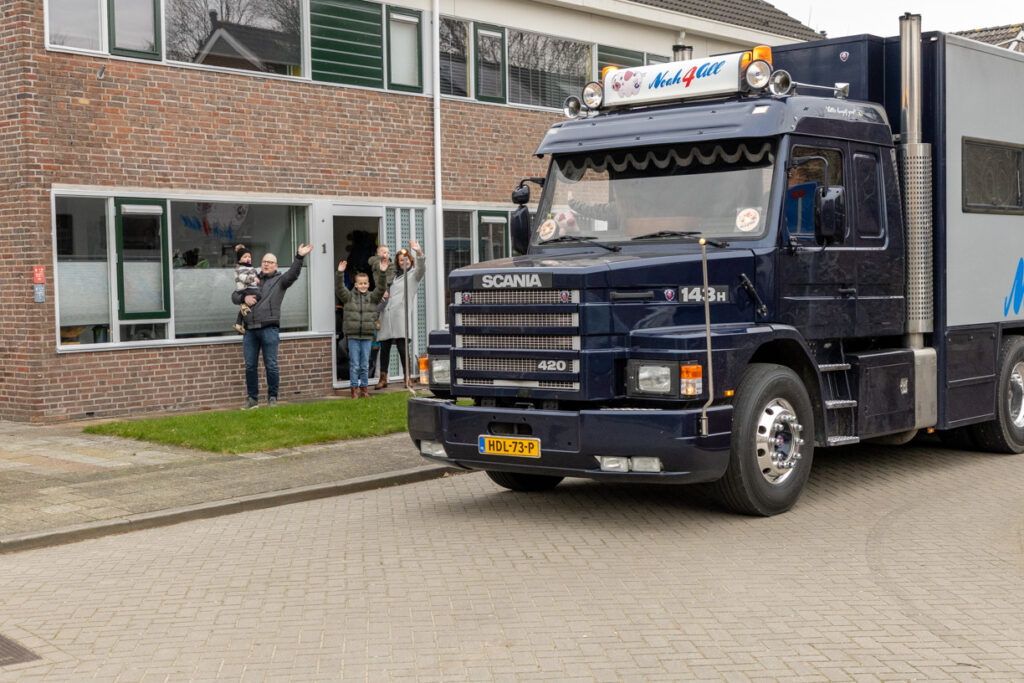 Ons team hoefde zich niet voor te stellen; hij volgde ons op social media. Nooit wetend dat we voor Koos zouden komen. Koos’ gedachten gingen op dat moment terug naar vroeger. Toen hij zelf aan het stuur zat voor NTM bulktransporten en later in de winkeldistributie. Wat is dit vak toch mooi. Nu mocht hij weer plaatsnemen in de cabine voor een dag vol verrassingen, zij het naast de chauffeur, maar toch in de truck, een lang gekoesterde wens. De route ging naar Bartje langs de A28 bij Beilen, waar familie en vrienden hem opwachtten; het weerzien was erg emotioneel.