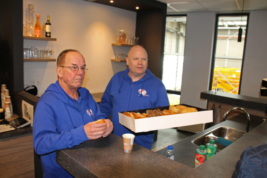 De route van het konvooi ging van de haven naar het Westland en weer terug naar Maasland waar wij te gast waren bij de firma Boekestijn, de werkgever van Joey, de zoon van Rene. Daar stond de familie hem op te wachten, zijn vrouw Marianne was ook verrast want die wist ook van niets. De kleinkinderen hadden een mooi spandoek opgehangen en vingen hun opa op in hun armen, mooi om te zien. Wij mochten gebruik maken van de kantine en daar werd ook de lunch geserveerd, er kwamen nog meer gasten naar Boekestijn toe om Rene te zien, te spreken en te bedanken.