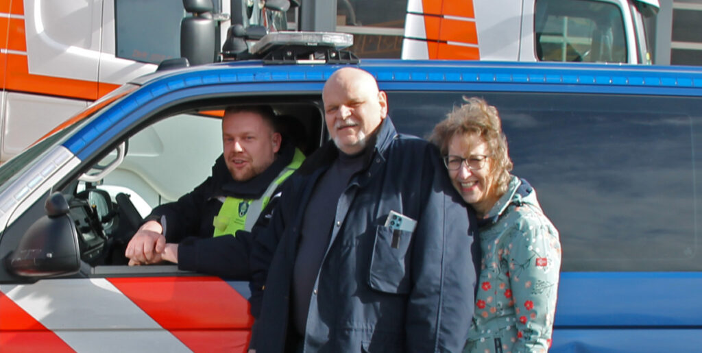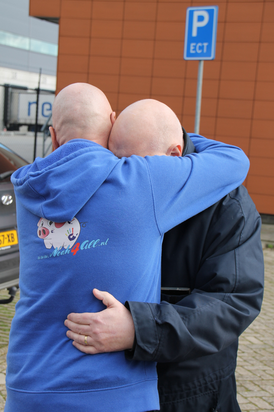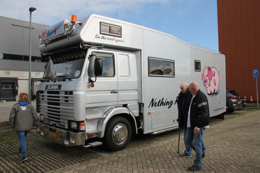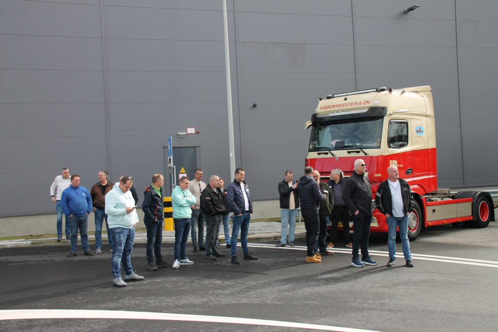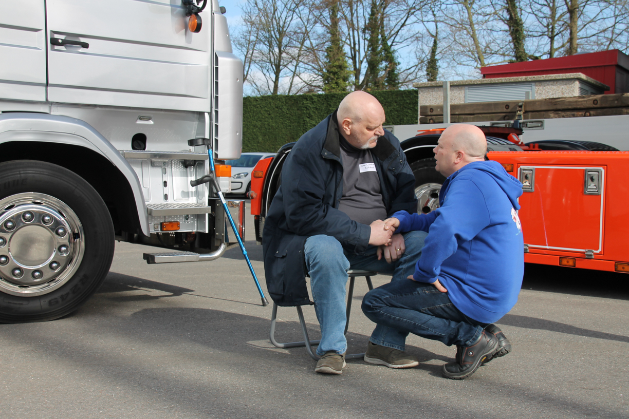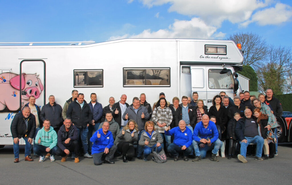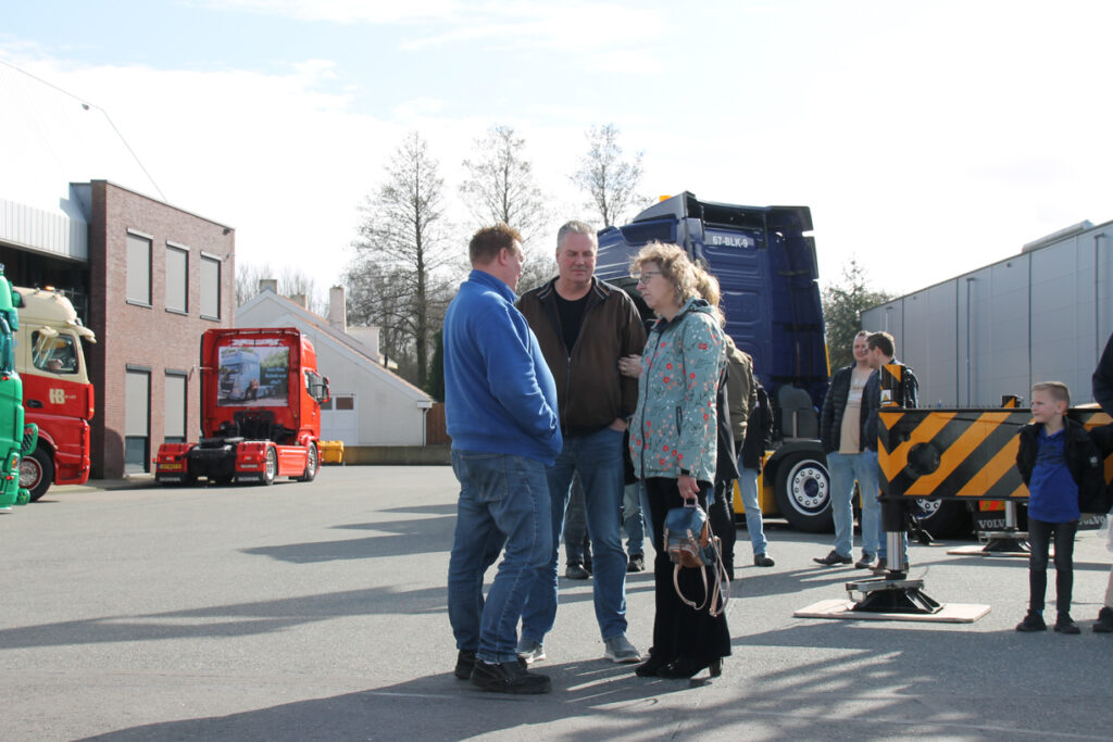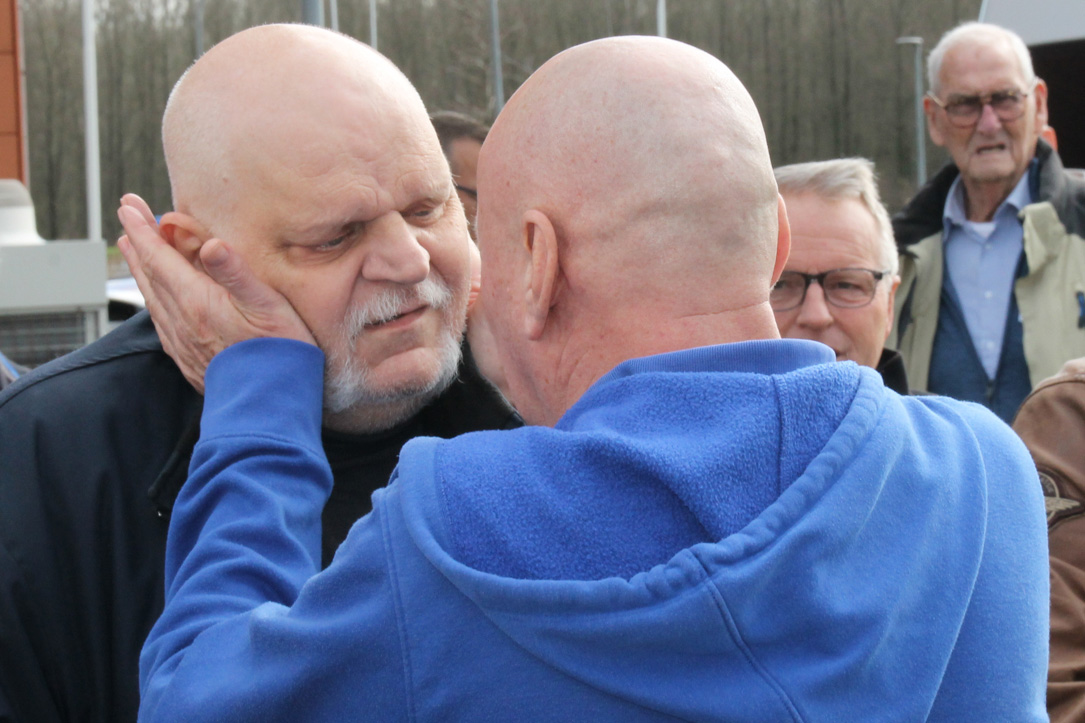 Rene moest mee, en met lichtelijke dwang en met ‘vriendelijke’ verwensingen aan het adres van Frank stapte hij toch de wenstruck in. Een Scania dat was toch aan het zere been van Rene. Hoongelach klonk toen hij door de aanwezige daarop werd gewezen maar onder luid applaus vertrokken wij richting Maasland. Om de hoek stonden zijn collega’s, die hem zo dichtbij het hart staan, hem op te wachten wat voor nog meer emoties zorgden.