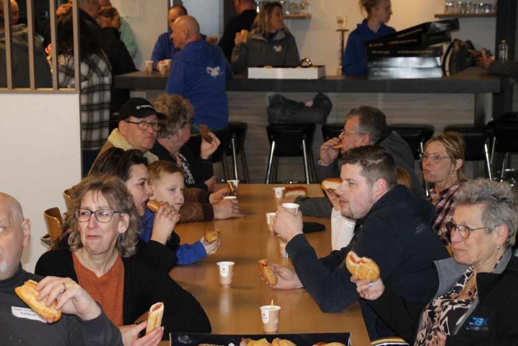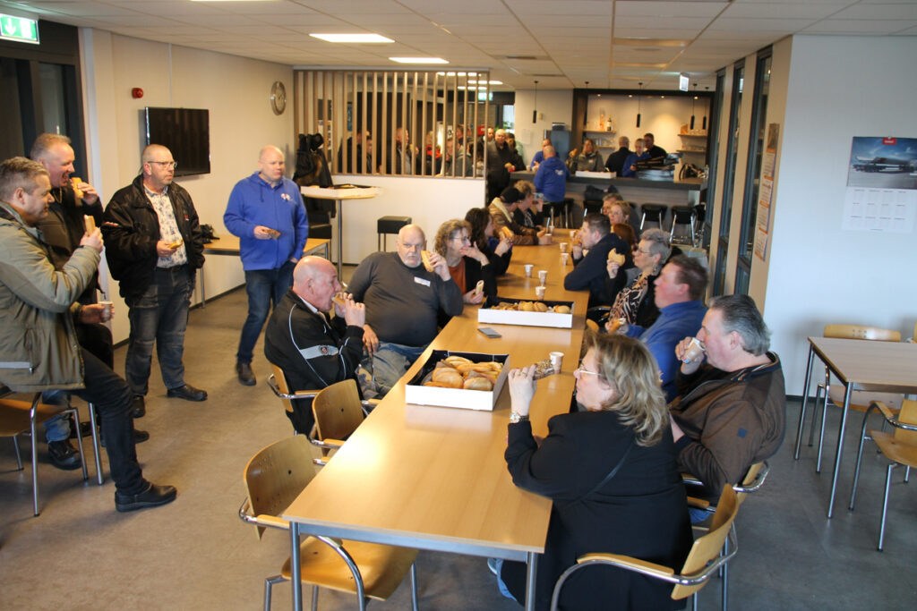 De route van het konvooi ging van de haven naar het Westland en weer terug naar Maasland waar wij te gast waren bij de firma Boekestijn, de werkgever van Joey, de zoon van Rene. Daar stond de familie hem op te wachten, zijn vrouw Marianne was ook verrast want die wist ook van niets. De kleinkinderen hadden een mooi spandoek opgehangen en vingen hun opa op in hun armen, mooi om te zien. Wij mochten gebruik maken van de kantine en daar werd ook de lunch geserveerd, er kwamen nog meer gasten naar Boekestijn toe om Rene te zien, te spreken en te bedanken.