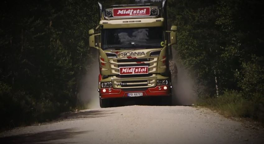Met de juiste muziek op de achtergrond is het 2:27 minuut genieten van de Scania R730 zwaartransporttrekker, die eerst een bosbouw-machine door het ruige en mooie Noorwegen vervoert om later een zware vergruismachine op het diepbed te hebben en aan te pikken. De video staat op de YouTube-pagina van voor Norsk Scania AS.
