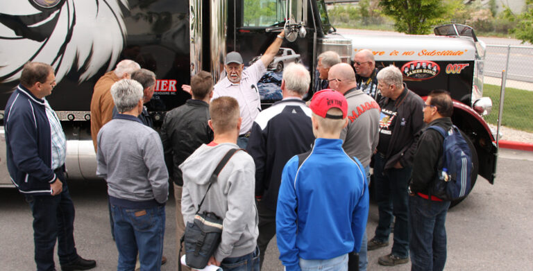 Winus vertelt het reisgezelschap alles wat ze weten willen over de imposante Peterbilt, en het werken en leven als chauffeur in Amerika.