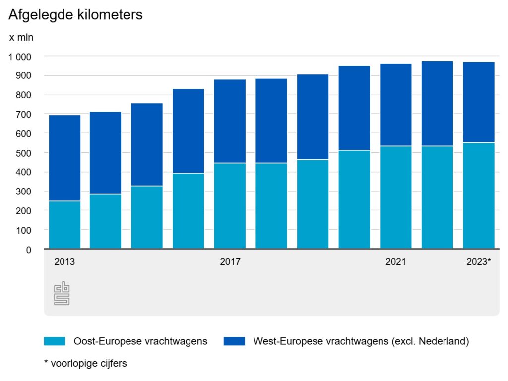 De laatste jaren is er een sterke toename van het goederentransport door Oost-Europese vrachtwagens van of naar Nederland. In 2023 vervoerden zij 55,4 procent van het vervoerde gewicht (57 miljoen ton goederen), in 2007 was dat 19,4 procent (15 miljoen ton).