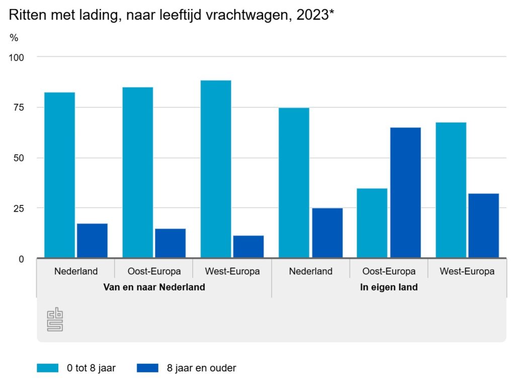 In eigen land rijden vervoerders uit Europese landen juist vaak met oudere vrachtwagens. In 2023 werd in Oost-Europa bij 65,1 procent van de ritten in eigen land gebruikgemaakt van een vrachtauto van acht jaar of ouder. In Nederland reed 25,3 procent met een vrachtwagen van acht jaar of ouder.
