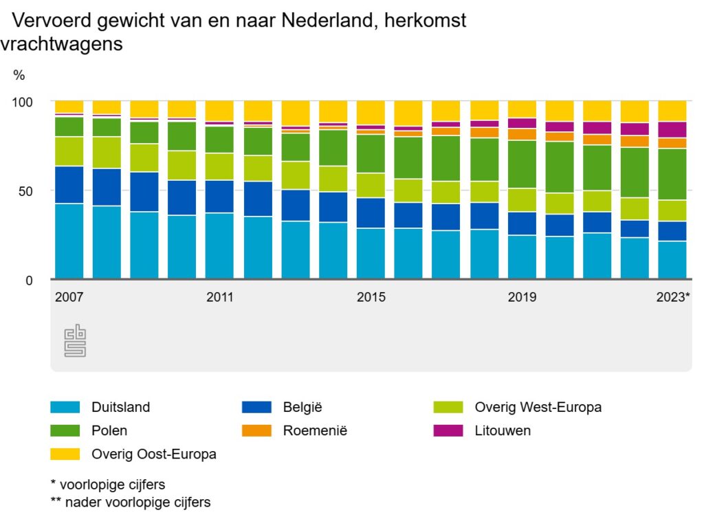 Van de buitenlandse vrachtwagens vervoerden Poolse vrachtwagens in 2023 de meeste goederen (30 miljoen ton) vanuit of naar Nederland. Dat is 29,1 procent van het totaal vervoerde gewicht door buitenlandse vrachtwagens. In 2007 vervoerden Poolse vrachtwagens 10,9 procent van het door buitenlandse vrachtwagens vervoerde gewicht. Ook Roemeense en Litouwse vrachtwagens vervoerden in de periode 2007-2023 meer goederen. Het aandeel door Belgische en Duitse vrachtwagens vervoerde gewicht van of naar Nederland is in deze periode gehalveerd.