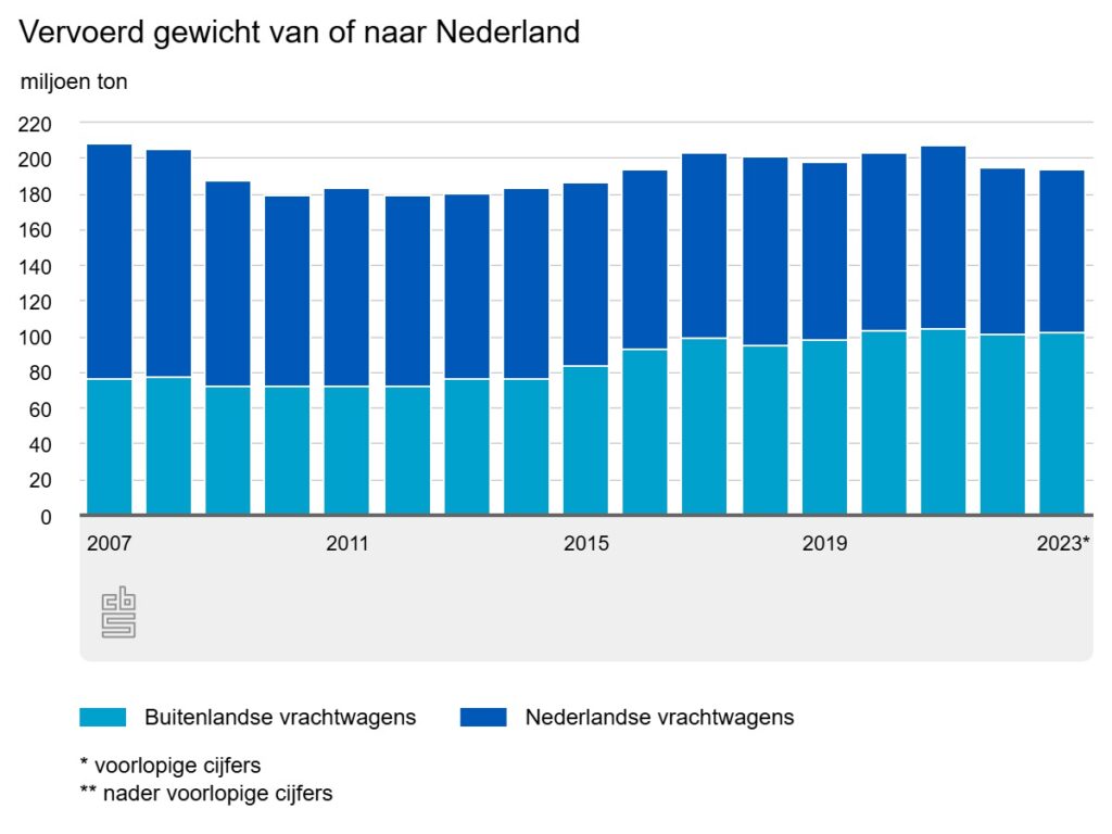 In 2023 werd voor 194 miljoen ton goederen over de weg vervoerd vanuit of naar Nederland. Buitenlandse vrachtwagens vervoerden iets meer dan de helft van deze goederen (53,1 procent). De afgelopen jaren vervoerden buitenlandse vrachtwagens steeds meer goederen. In 2023 vervoerden zij voor het vierde jaar op rij meer goederen dan Nederlandse vrachtwagens.