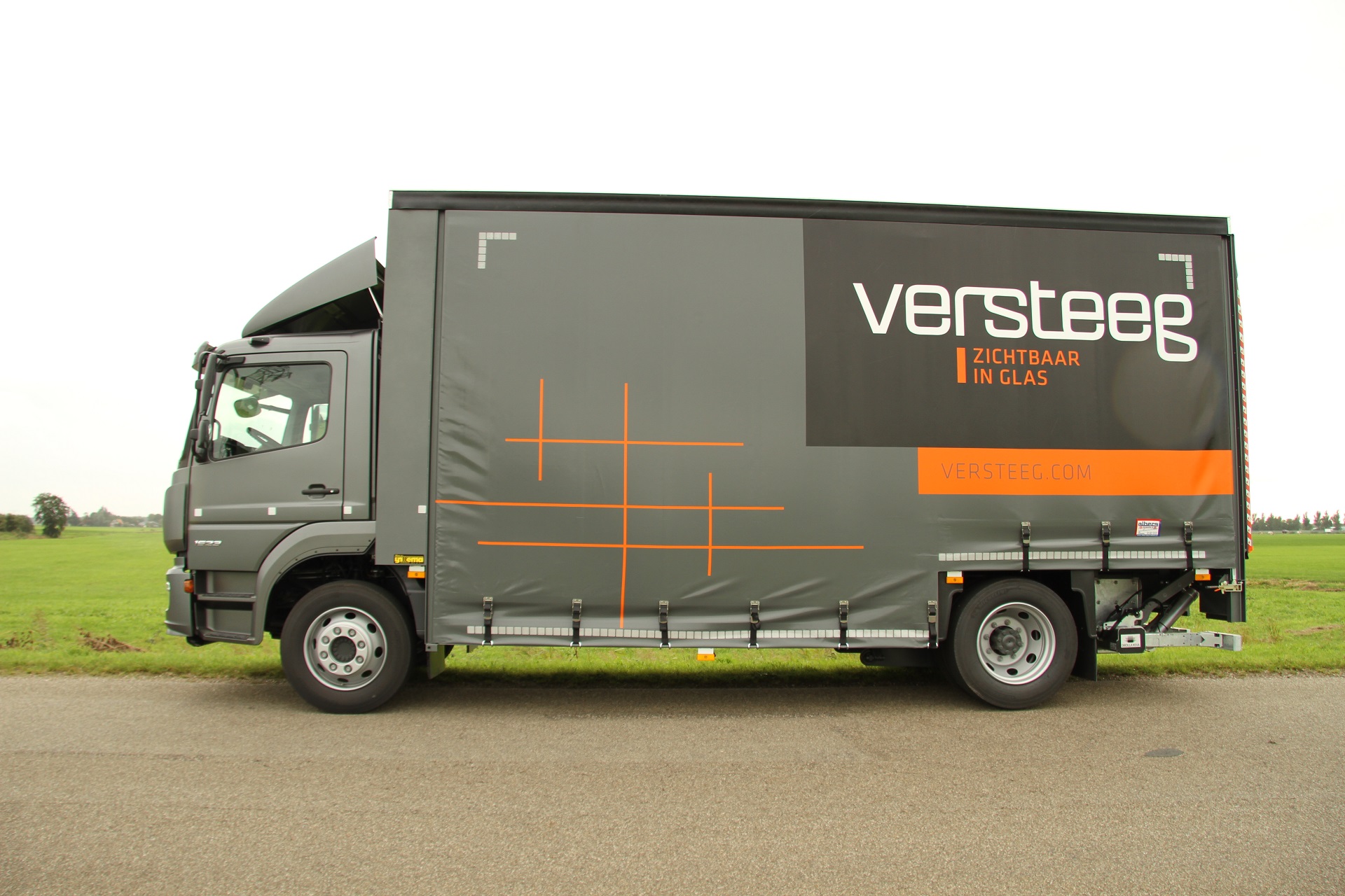 De gehele opbouw is gespoten in een metallic lak en voorzien van full colour schuifzeilen. Dit alles in de huisstijl van Versteeg Glas. Aan de binnenzijde is er een ruimte ingericht voor een glasrobot type KS 350 offroad.