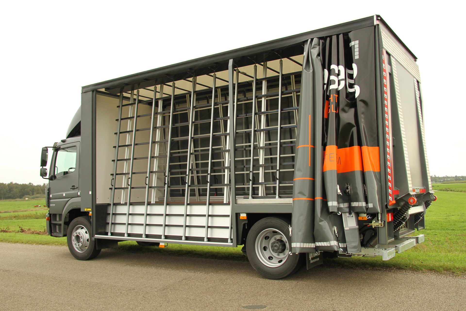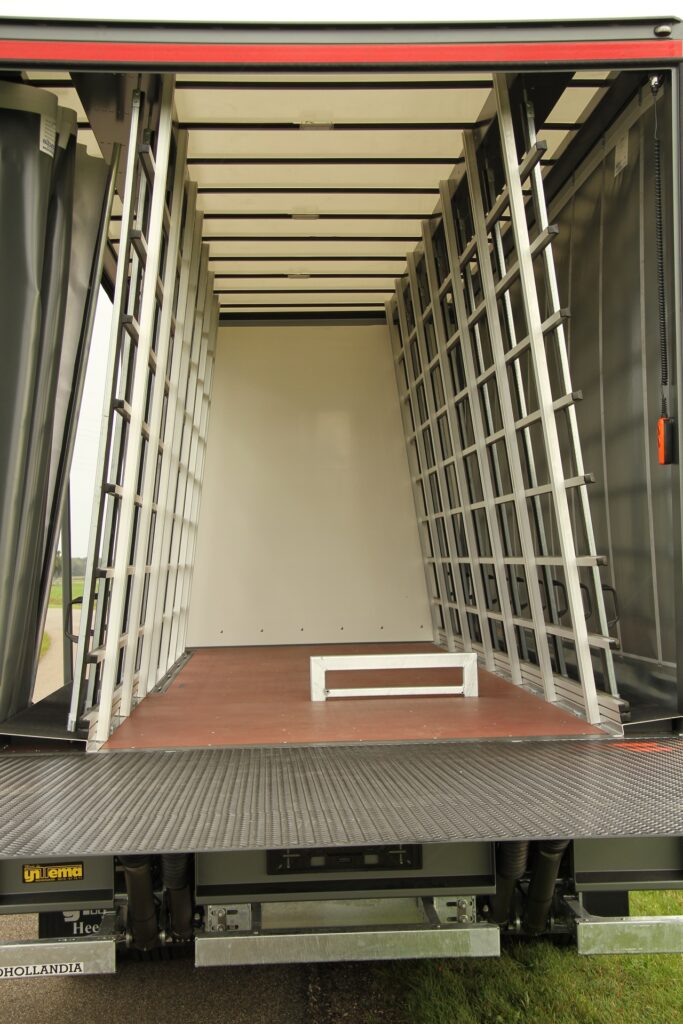 De Mercedes Atego is rondom volledig verbouwd en zo efficiënt mogelijk ingedeeld. Dit is gedaan om een zo groot mogelijk laadoppervlak over te houden. Marc Klaassen van IJntema Carrosseriebouw: “Zodoende is aan de linkerzijde de ruimte tussen voor- en achteras volledig vrij gehouden en voorzien van een lichtgewicht glasresteel van 3.400 mm lang en 3.100 mm hoog.” De brandstoftanks en kisten moesten daarvoor wijken naar de rechterkant van Atego. “Aan de rechterzijde is een glasresteel van 6.150 x 2.400 mmn gemonteerd.”