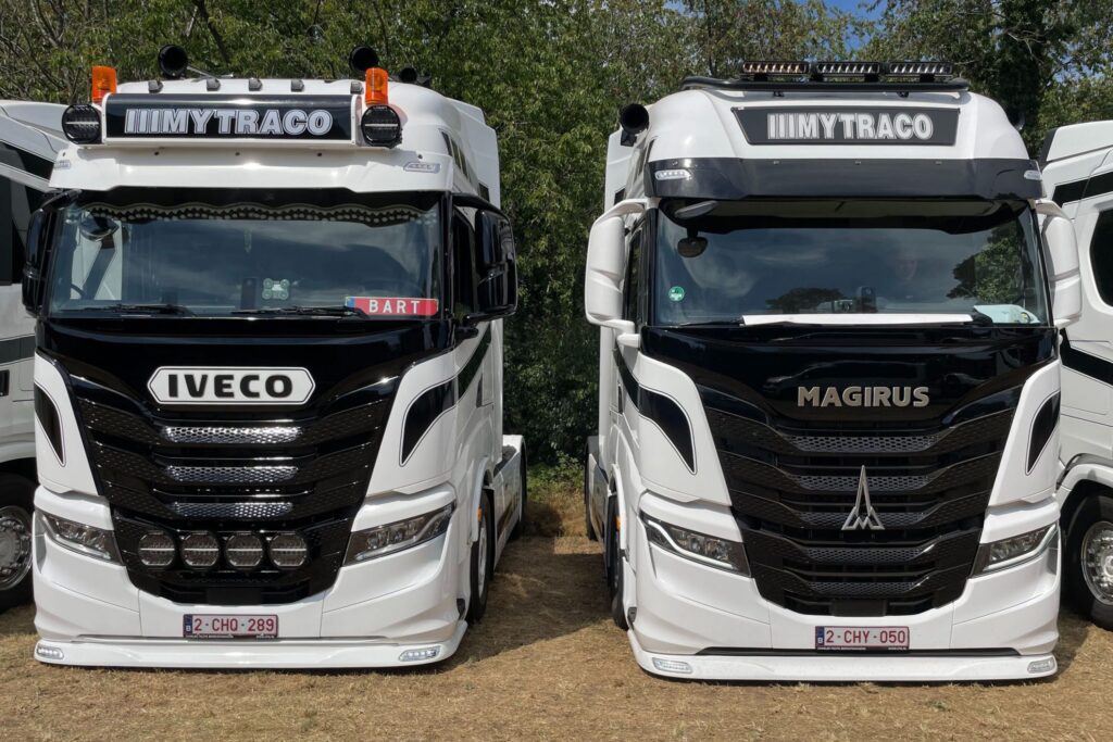 De eerste Iveco S-Way van Mytraco rijdt sinds medio 2021 voor het bedrijf en was ook al flink naar de hand gezet. Van een afstandje mogen ze op elkaar lijken, wie even de tijd neemt ziet de nodige verschillen. Neem bijvoorbeeld het Magirus Deutz-logo op de plek waar normaal het Iveco-logo te vinden is, of de andere kleur voor de zonneklep en de spiegels. Zo onderscheiden de wagens zich op een subtiele wijze van elkaar. En dat valt truckliefhebbers en collega-transporteurs toch op. “Onlangs kreeg ik nog een mail met de vraag waar ik dat verlichte Magirus Deutz-logo vandaan had.” Dat blijkt maatwerk te zijn: “De toren in het logo komt van een oldtimer.”