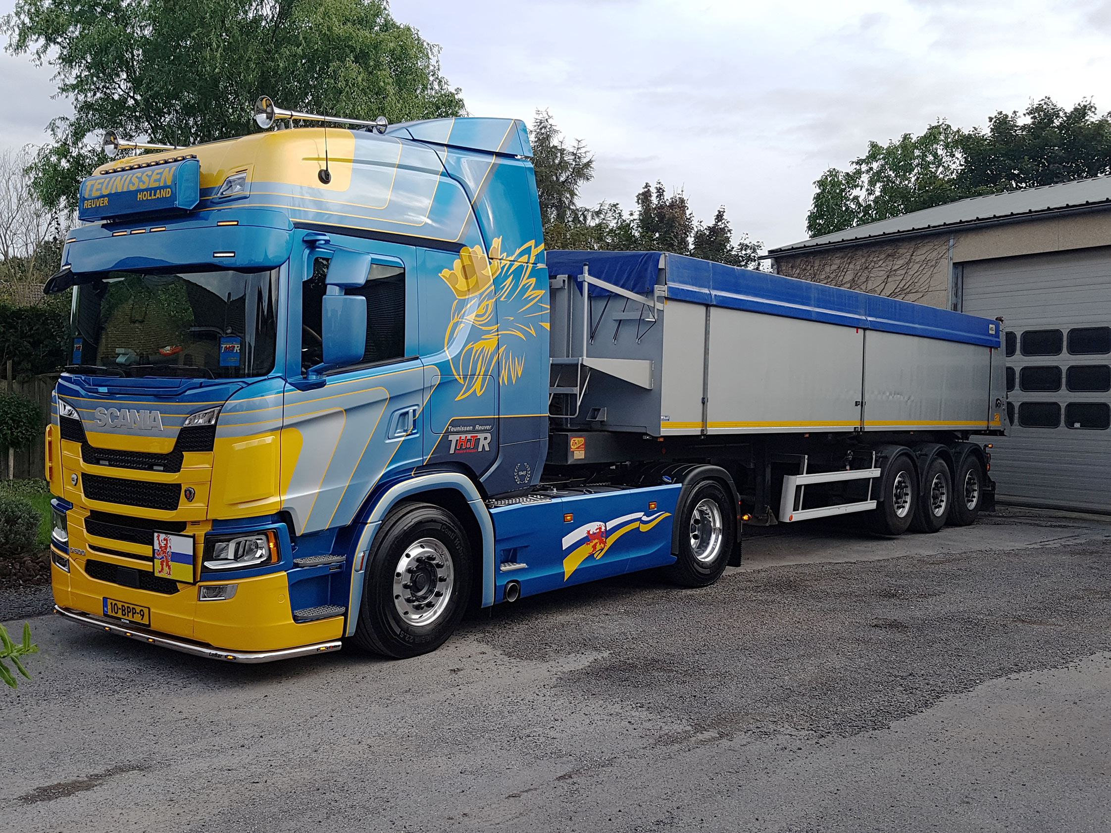 Wiel maakt van elke truck opnieuw een feestje en hangt daarbij niet aan één vaste bedrijfskleur. “Ik heb wel een vast logo: Dat bestaat uit een gestileerde T en een R van Teunissen Reuver gecombineerd met H&T van ‘Handel en Transport’. De vorige was mooi diep bordeauxrood. Deze heb ik wat frisser in de kleur gezet met geel en een aflopend blauw. Dat is gedaan door Cranen in Heeswijk Dinther. Ik vind het goed gelukt. Verder heb ik de auto van buiten aangekleed met Alcoa’s, een lagere voorbumper met daaronder een RVS sierbeugel, sideskirts, LED-verlichting, een paar Hadley’s en een lichtbak.”
