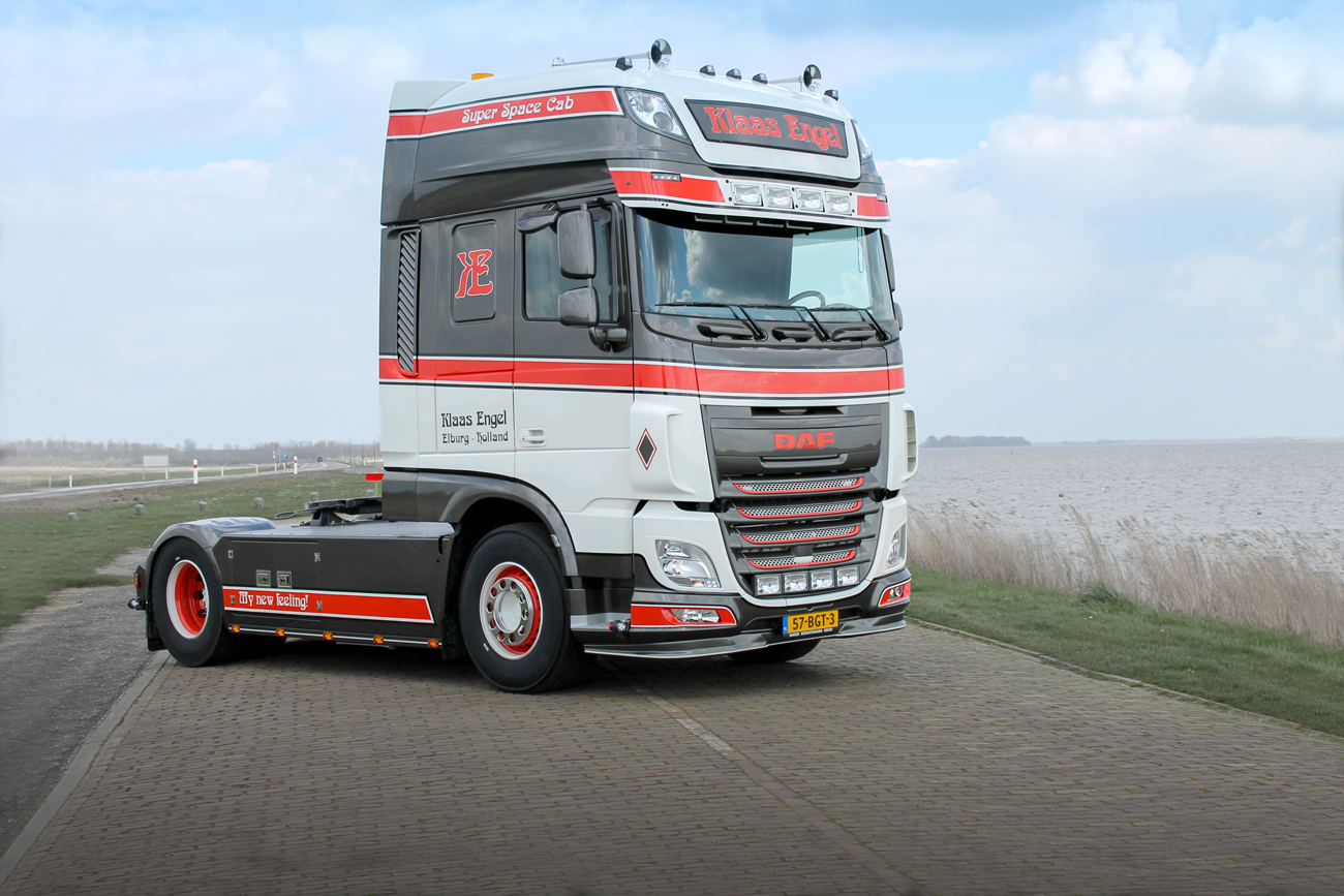 Eigenrijder Klaas Engel uit Elburg nam onlangs een opvallende en origineel gespoten nieuwe DAF XF in gebruik.