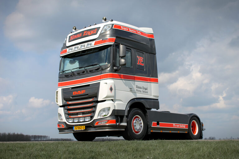 Het is een XF 440 met Super Space Cab en de nieuwe MX-11-motor met het hoogste vermogen van 440 pk, zo vertelt Klaas Engel. “Die motor bevalt goed ja. Ik heb er een drie-asser achter hangen maar qua totaalgewicht kom ik eigenlijk nooit boven de 35 ton uit.”