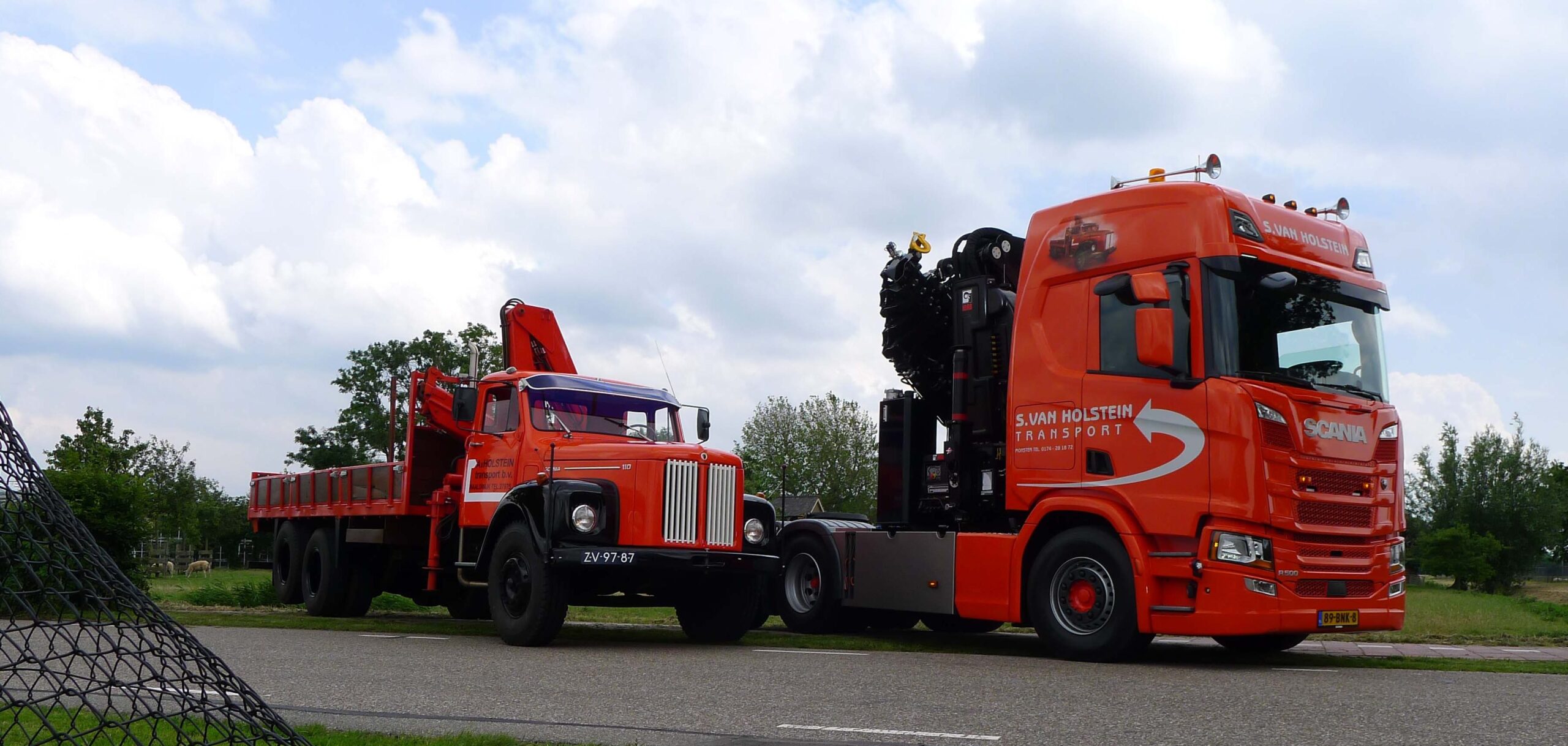 De aflevering van de nieuwe truck viel min of meer samen met een andere feestelijke gebeurtenis bij Van Holstein. “Mijn vader begon ooit op een Scania LBS110. Die is natuurlijk op een gegeven moment verkocht. Maar een paar jaar geleden vonden wij de auto terug in Barneveld. Hij was wel enorm gekannibaliseerd voor onderdelen maar toch heb ik hem gekocht en hem geheel in de oude staat teruggebracht. Hij was net klaar toen de nieuwe R500 kwam.”