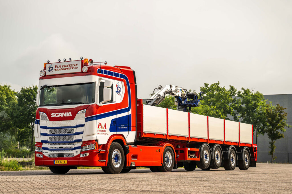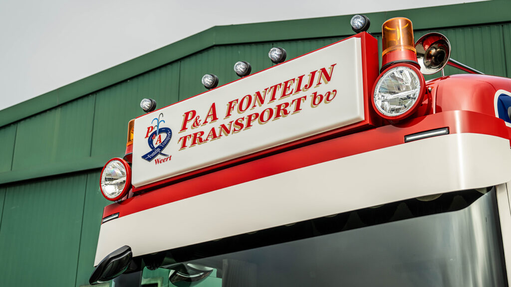 Ook de afwerking in de huisstijlkleuren van P&A Fonteijn Transport draagt bij aan het totaalplaatje. “Onze voertuigen zien er altijd strak en verzorgd uit,” zegt Fonteijn. “We wassen ze wekelijks. Het is en blijft ons visitekaartje op de weg.”