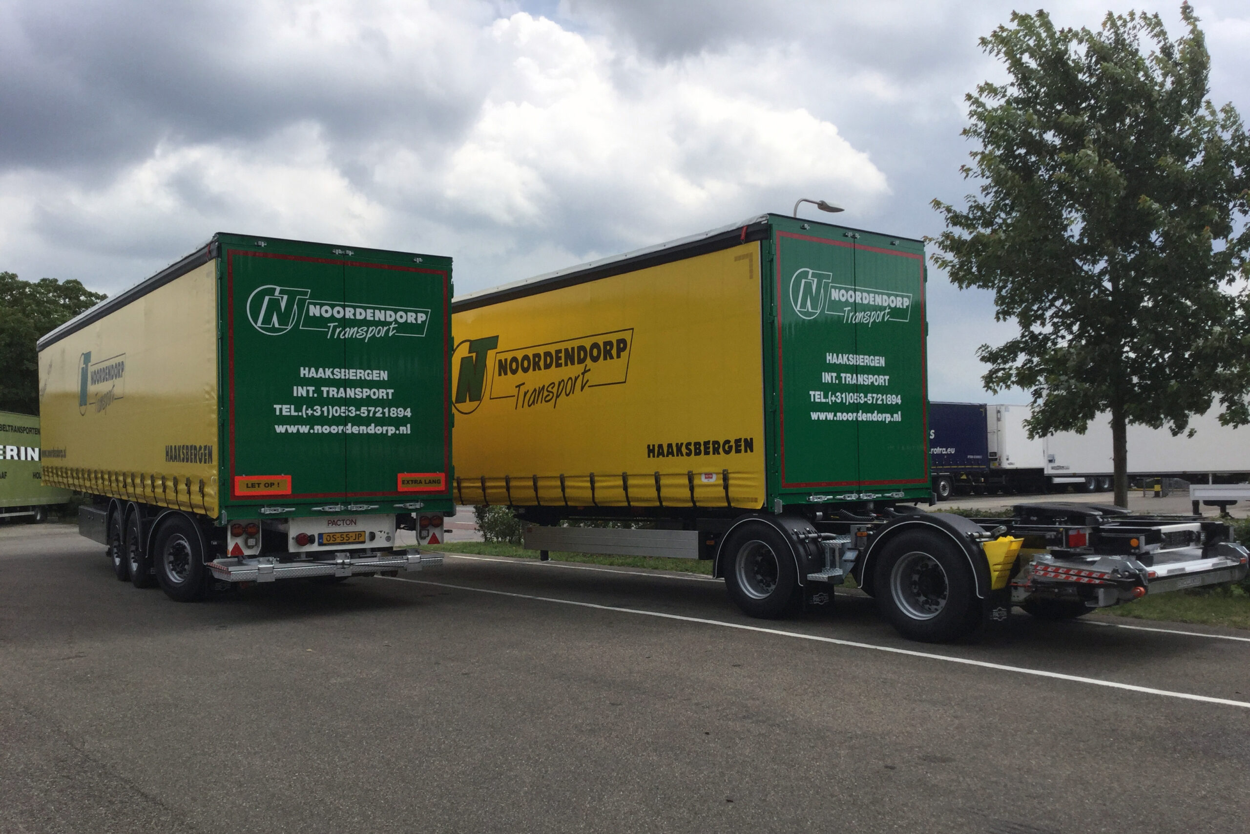 De nieuwe LZV bestaat uit een korte B-Double oplegger (type BXD.232.T-BELP1), met een verschuifbaar asstel met koppelingsschotel. De SAF tientons assen zijn widespread geplaatst. De laatste as is naloopgestuurd. Pacton leverde twee achterste opleggers voor de LZV-combinatie, zodat er gewisseld kan worden. De twee drieassige opleggers zijn onder meer Tridec stangengestuurd, beschikken over schuifzeilen, schuifkap, zijborden en een onderschuiflaadklep. Opvallend is ook de zogenaamde Airtube in zowel de B-Double als de beide volgopleggers. Deze Airtube kan worden opgeblazen om voor het wegrijden de zeilen te ontdoen van water en/of ijs. Zo kan Noordendorp Transport altijd veilig op weg met de nieuwe LZV-combinatie.