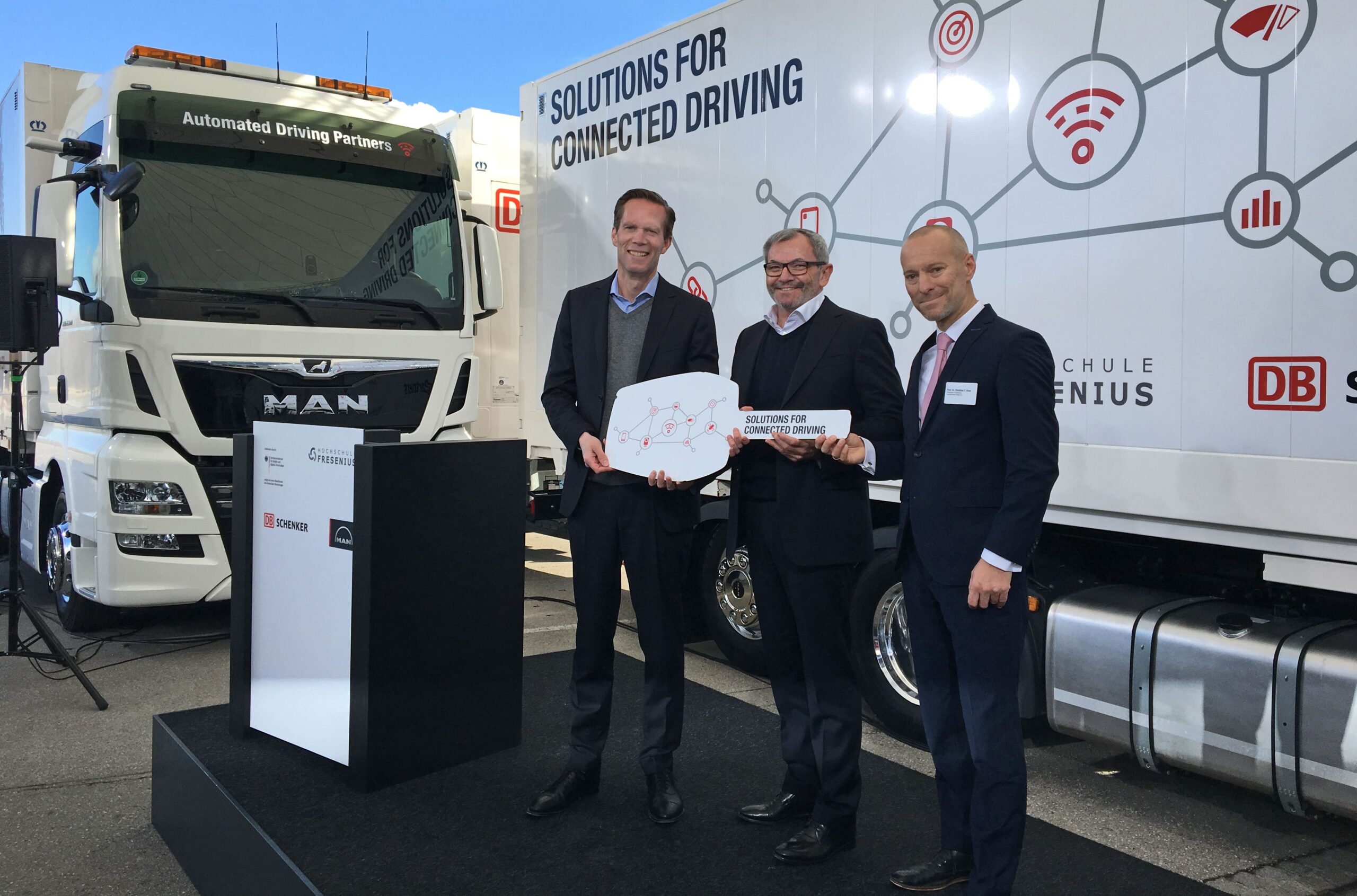 MAN Trucks & Bus leverde vandaag bij DB Schenker de eerste trucks af. De proef wordt vanaf april rustig opgebouwd. In eerste instantie rijden alleen lege vrachtwagens heen en weer, waarbij er nog gewoon chauffeurs achter het stuur zitten. Als dat goed gaat, gaan volledig volgeladen trucks autonoom in colonne meermaals per dag de weg op.