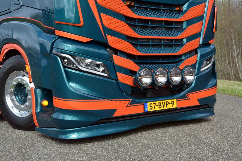 Alle trucks van Postma Transport zijn naast de fraaie huisstijl met metallic groen en oranje rijkelijk voorzien van extra’s. De trucks zijn dan ook regelmatig te zien in de showstraat op het Profile Truckstar Festival. Kornelis Postma: “Voor ons stond meteen vast dat ook de nieuwe Iveco een dikke auto moest worden. We hebben eerst een ontwerp laten maken in onze huisstijl, waarna G. Koopmans in Gerkesklooster aan de slag ging met de opbouw. Vervolgens is de truck gespoten bij Maurits in Bedum. Het resultaat mag gezien worden lijkt ons.” Voor een speciaal interieur wordt de truck later nog onder handen genomen door Super VK Design in Harkema.