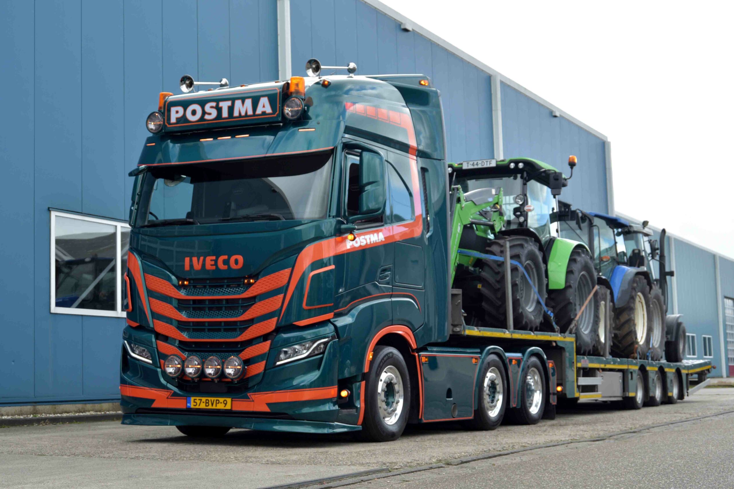 Postma Transport Grijpskerk heeft een nieuwe Iveco S-Way AS440S57TX-FP op de weg gezet. Die type aanduiding staat voor een S-Way met 570 pk en een sturende, liftbare voorloopas. De trekker wordt ingezet voor het internationaal transport van met name landbouwmachines.