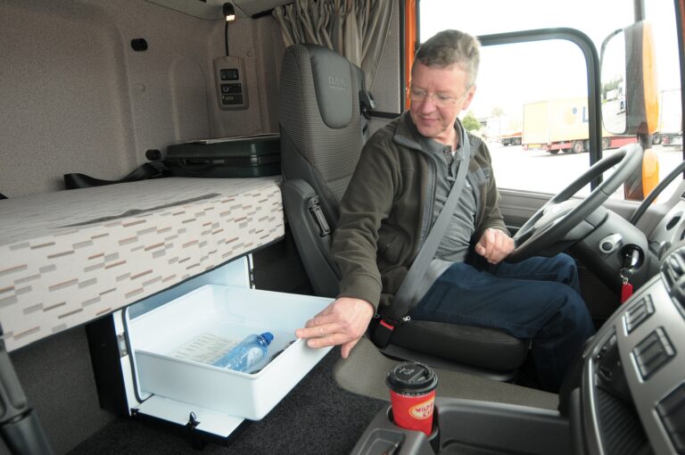 Onze DAF had ook de bijzondere Super Air-stoel met verstelbare schoudersteun in de hoge rugleuning en, naast tweetraps stoelverwarming, ook actieve stoelventilatie (luchtafzuiging). Dat vinden wij méér dan fijn: zo’n stoel houdt je fit en dat is veilig. Ook veilig zijn de standaard gordelspanners en airbag. In combinatie met de passieve kreukelzone waarbij de cabine bij een botsing 40 cm naar achteren kan schuiven zonder los te breken, is dat een mooi veiligheidssysteem voor de chauffeur. Moet je natuurlijk wel je gordel omdoen!