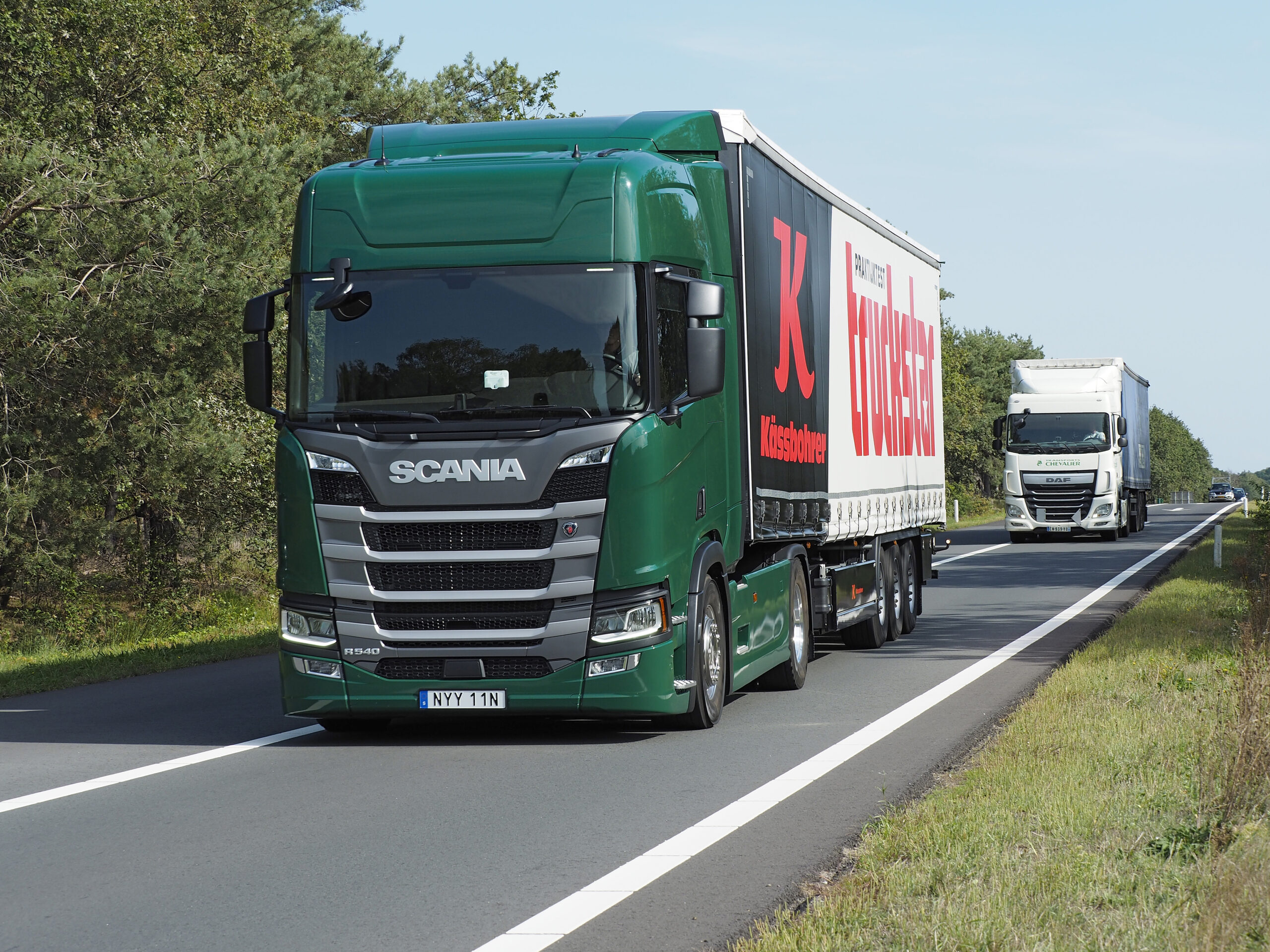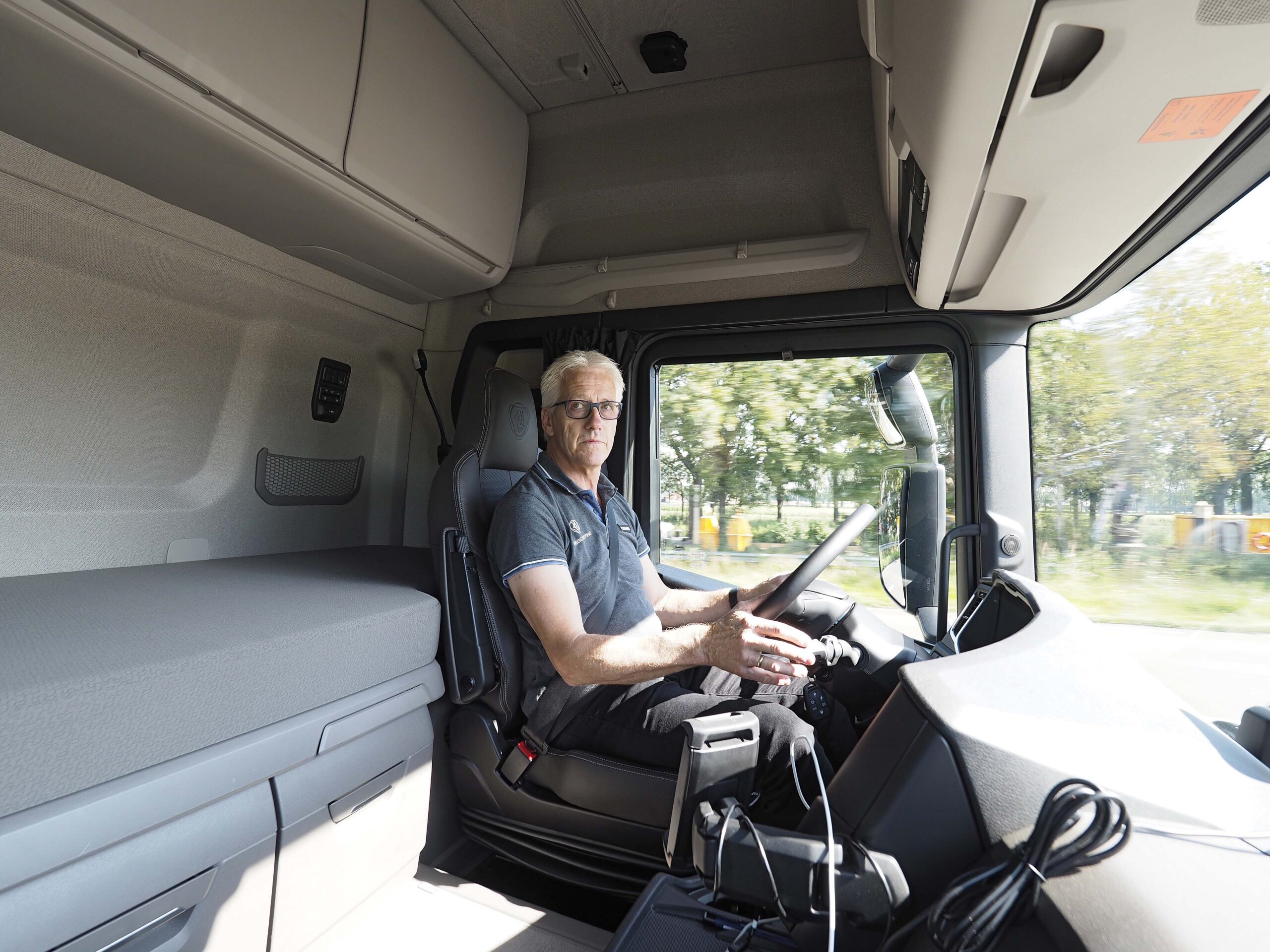 Maar het is zeer de vraag of we dat merken. Het grootste verschil tussen de 540 en de V8 520-uitvoering is dat deze 540 een voor Scania ongekend lange eindreductie heeft van 1:2,35 tegenover 1:2,59 voor de V8. Dat houdt het toerental bij 80 km/u op slechts 1.000 per minuut, maar kost wel trekkracht en responstijd. Op het vlakke deel van onze test zullen we er brandstoftechnisch voordeel van hebben, maar op de hellingen van de Ardennen kunnen de prestaties wel eens tegenvallen. Voor we dit ervaren, lopen we eerst ons rondje rond de truck. Voor onze test heeft Scania de nieuwe motorvariant verstopt onder een gewone R Highline-cabine en die kennen we inmiddels uit en te na. Ook deze truck heeft de fijne, elektronisch aangestuurde handrem annex hill holder, een vrijloop-retarder en ACC. Er zit een enkel bed in de cabine en een kastenwand. Dat is mooi voor de bergruimte, maar standairco zit er dan weer niet op. En uiteraard heeft Södertälje ons weer bedeeld met een voorruit zonder zonneklep. Want dat ziet er zóveel beter uit op de foto … Maar goed, alles voor de wetenschap en die klep zou zomaar een paar tienden kunnen schelen.