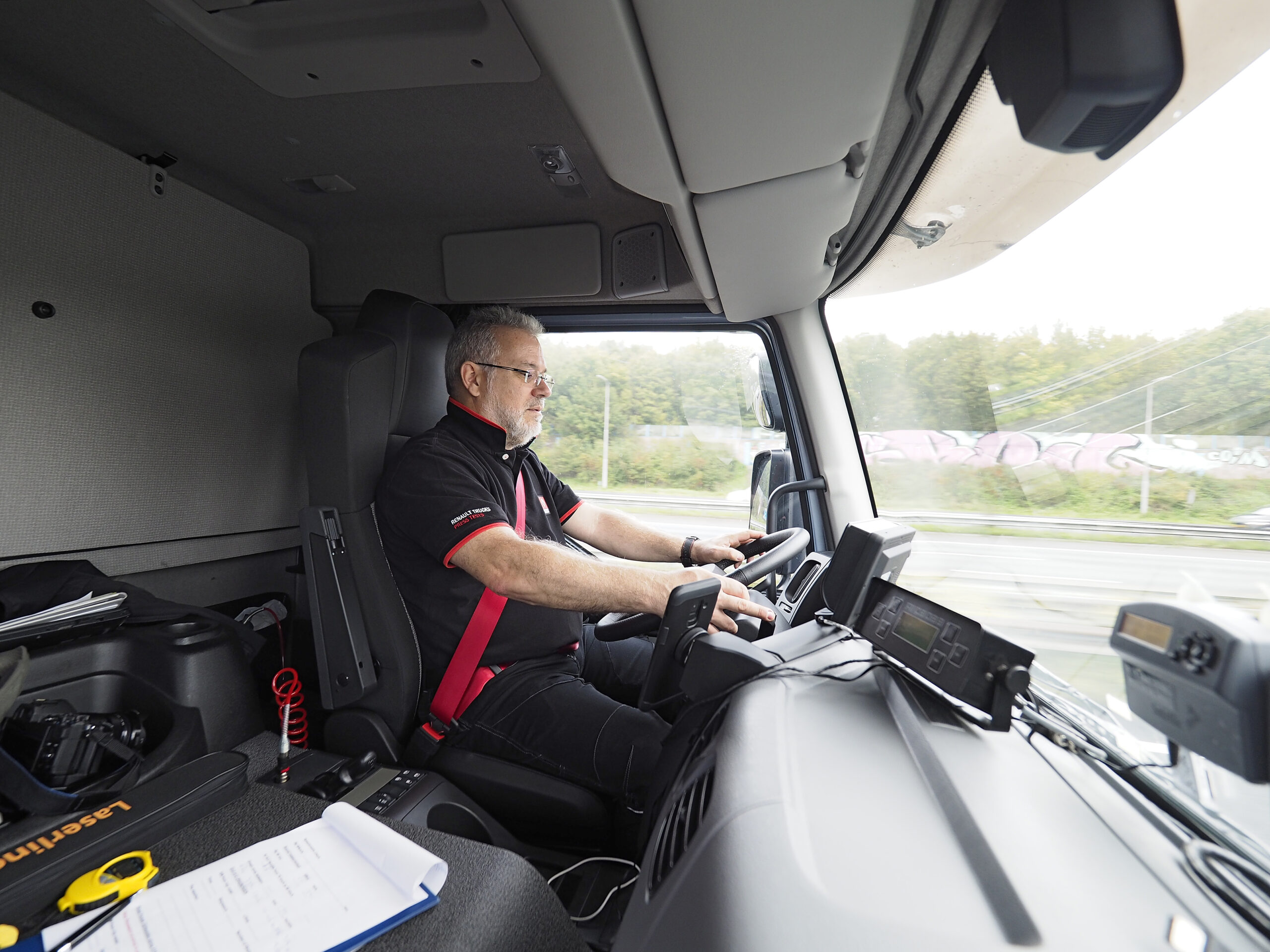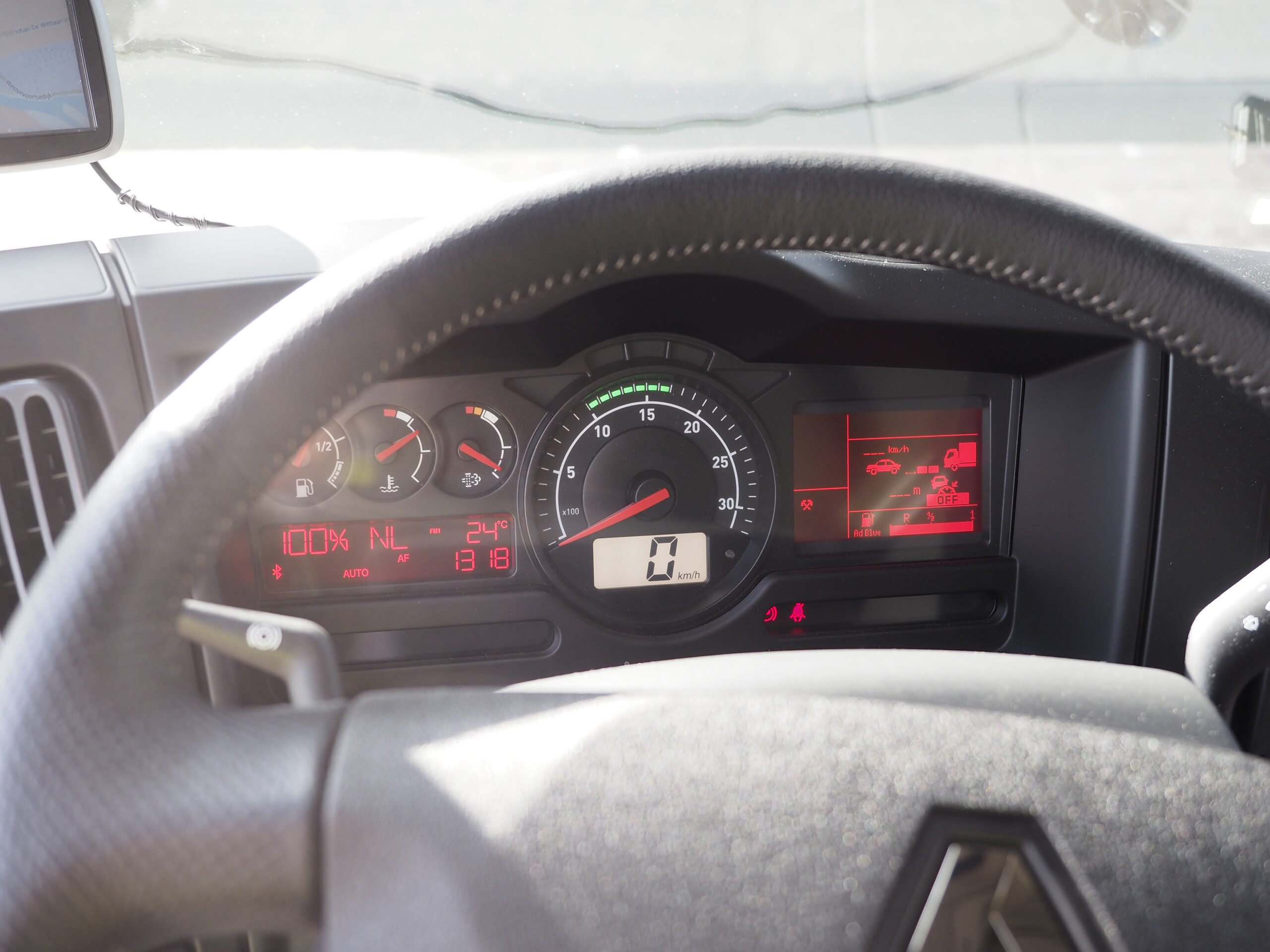 Het zicht vanaf de bestuurdersstoel naar voren is goed. Op rechts zit het bekende veilige ‘fietsersdetectieruitje’ dat Renault destijds als eerste truckmerk lanceerde. Maar waar in die tijd geen chauffeur iets van moest hebben. Tijden veranderen en nu is het één van de meest prettige en actieve veiligheidsmiddelen van deze cabine. De rechterspiegel geeft een iets minder grote dode hoek dan bij de T-cabine maar het zicht tussen spiegel en A-stijl blijft beperkt voor een truck die toch veel in de stad te vinden zal zijn. Gelukkig heeft deze Renault een Brigade Backeye 360ᵒ monitor met zicht rondom de auto, ook van boven. Daartoe zitten er vier cameraatjes op elke zijde van de auto één. Als je de auto in de achteruit zet, zie je op het grootste deel van het splitscreen de achterkant. Het werkt goed, is duidelijk zichtbaar en mag van ons verplicht worden op elke distributieauto. Typisch Renault is ook de satelliet aan het stuur waarmee de boordcomputer en de radio bediend wordt. Op de handle van de versnellingsbak kun je ook even studeren. Maar als je dat eenmaal weet, geeft die verder geen problemen.