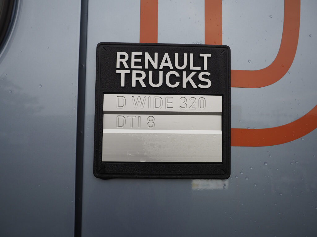 De D Wide heeft een beleefde maar modern ogende grille met daarin prominent een stevig en in reliëf uitgevoerd versie van het Renault wybertje. We nemen de heldere lexan koplampglazen en de moderne radarunit in de stevige uit drie delen bestaande bumper in ons op. We aaien eens over de fraai vormgegeven fenderdelen die de zijkant inclusief de deurhandels schoonhouden. En we zien dat het goed is. Eigenlijk verraden alleen de gedateerde toplampjes links en rechts boven de spiegels dat we hier te maken hebben met een cabine die al in de jaren negentig van de vorige eeuw op de markt kwam. Kan daar nu niet eens een modern LEDje voor komen?