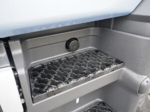 We noemden al het neerklapbare bed. Dat is in twee delen en hangt normaal plat tegen de achterwand. Wil je er op liggen, dan moet je eerst je hele cabine opruimen en de twee stoelen naar voren klappen voor je de beddelen kunt laten zakken. Daarna kun je er vanaf de tunnel opkruipen. Rust zacht. Als je nog niet moe was toen je aan het begin van je pauze aan deze exercitie begon, dan heb je dat extra comfort die het bed biedt inderdaad hard nodig om bij te komen gedurende de resterende tijd van je pauze. Maar er schijnen chauffeurs te zijn die zo hun driekwartier maken of er zelfs, hopelijk incidenteel, een hele nacht mee overstaan. Ons doet het denken aan een soortgelijke contraptie in een DAF uit de jaren zestig van de vorige eeuw. Dat was toen een hooggewaardeerde luxe. Maar dat is inmiddels 60 jaar geleden.