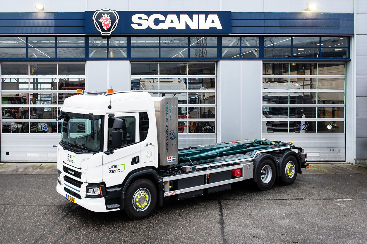 De nieuwe Scania-trucks zijn uitgerust met een e-PTO. Dit is in dit geval een elektrische aansluiting in het frame. De opbouwer kan hier spanning afhalen met een maximaal vermogen van 60 kW om de opbouw, zoals in dit geval een haakarmsysteem dat wordt opgebouwd door VDL Groep, elektrisch aan te drijven. De trucks kunnen dus onder alle omstandigheden volledig zero-emissie opereren.