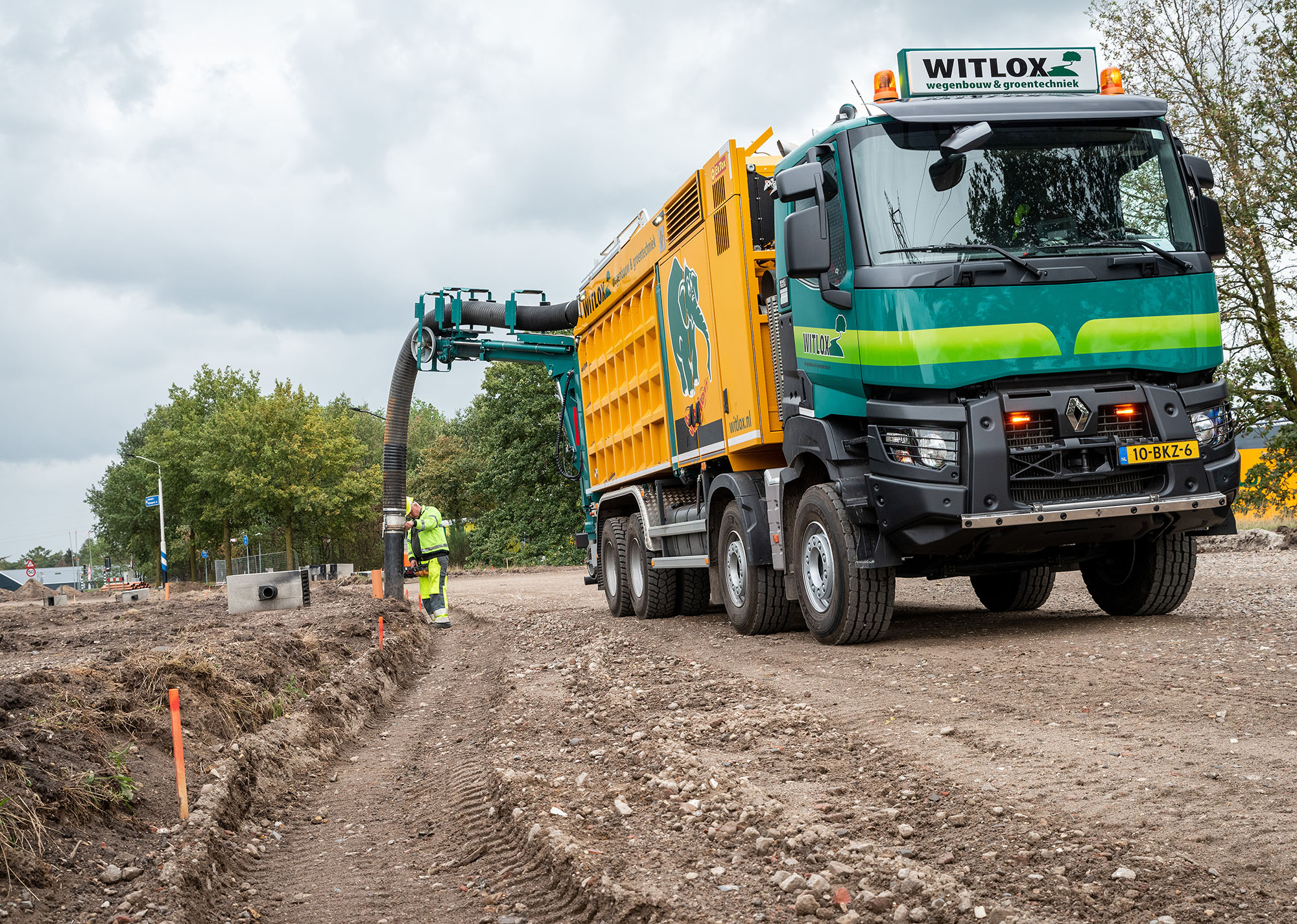 “We rijden al bijna 35 jaar Renault. Het zijn prettige en mooie trucks: stabiel en robuust, wat zeker in terreinwerk een voordeel is”, aldus Danny Witlox, eigenaar van Witlox Wegenbouw & Groentechniek. Hij heeft zich met zijn bedrijf gespecialiseerd in onder meer wegenbouw, bestrating, riool- en grondzuigtechniek. Voor die laatste activiteit is nu een Renault Trucks K 8×4 aan het wagenpark toegevoegd. “Deze zuigwagen zetten we voornamelijk in om grond weg te zuigen in kruipruimtes, rond kabels en leidingen en rond boomwortels. De vraag naar deze techniek neemt toe omdat hierbij niet het risico bestaat dat kabels en leidingen beschadigd raken. Bij graven is die kans wel aanwezig.”